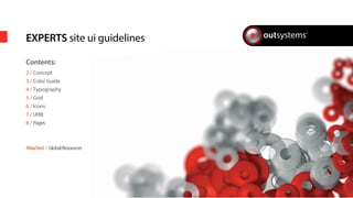 The document provides guidelines for designing the user interface for an internal and client-facing project management platform called Experts. It includes sections on color palette, typography, grid structure, icons, UI elements, and examples of key page layouts. The guidelines aim to maintain a consistent and clear user interface using the OutSystems brand styles.