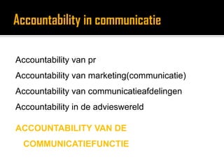 Accountability in communicatieAccountabilityvan prAccountability van marketing(communicatie)Accountability van communicatieafdelingenAccountability in de advieswereldACCOUNTABILITY VAN DE COMMUNICATIEFUNCTIE