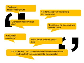 ‘’“Einde aan ‘fingerspitzengefühl’”“Performancevan de afdeling Communicatie”“Zichtbaar maken wat je doet”“Bepalen of we doen wat we moeten doen”‘’“Resultaten monitoren”“Beter weten waarom je iets doet”“De onderdelen van communicatie en hun invloed op het eindresultaat van communicatie tbv reputatie”