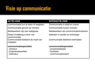 Methode: BalancedScorecardMarita Vos & Henny Schoemaker(2004)Kwaliteit communicatiefunctie wordt opgehangenaan kwaliteit communicatiedomeinenBenadering vanuit open systeemmodel organisatiesScorecard voorbedrijven en gemeenten