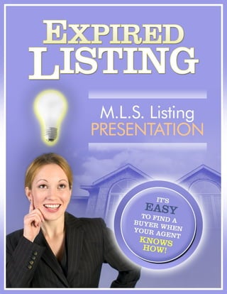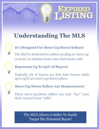 The document discusses how the MLS (Multiple Listing Service) can help sellers find buyers for their homes. It specifically targets move-up/down buyers, who make up 95% of buyers and purchase non-entry level homes priced 20-30% higher than their current home. It recommends identifying a target price range for the seller's buyers based on typical price increases and monitoring recently sold homes and their buyers.