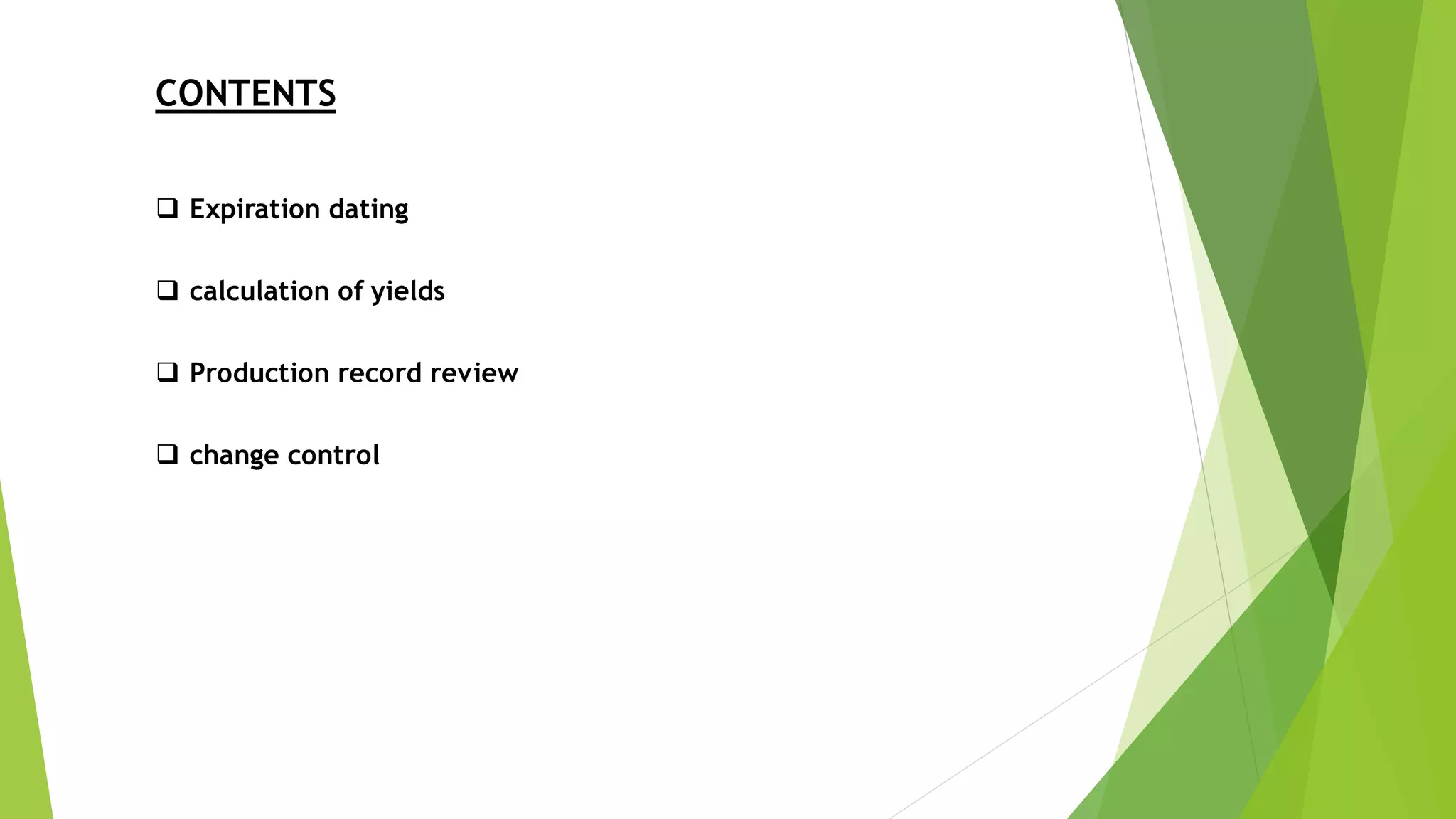 This presentation discusses key pharmaceutical manufacturing concepts including expiration dating, calculation of yields, production record review, and change control. Expiration dating is determined through stability studies to ensure the stated potency until the end of the product's shelf life. Production record review verifies that manufacturing was properly conducted according to established procedures. Change control manages all proposed alterations to validated processes through a formal review system.