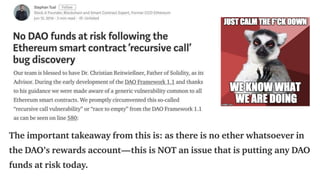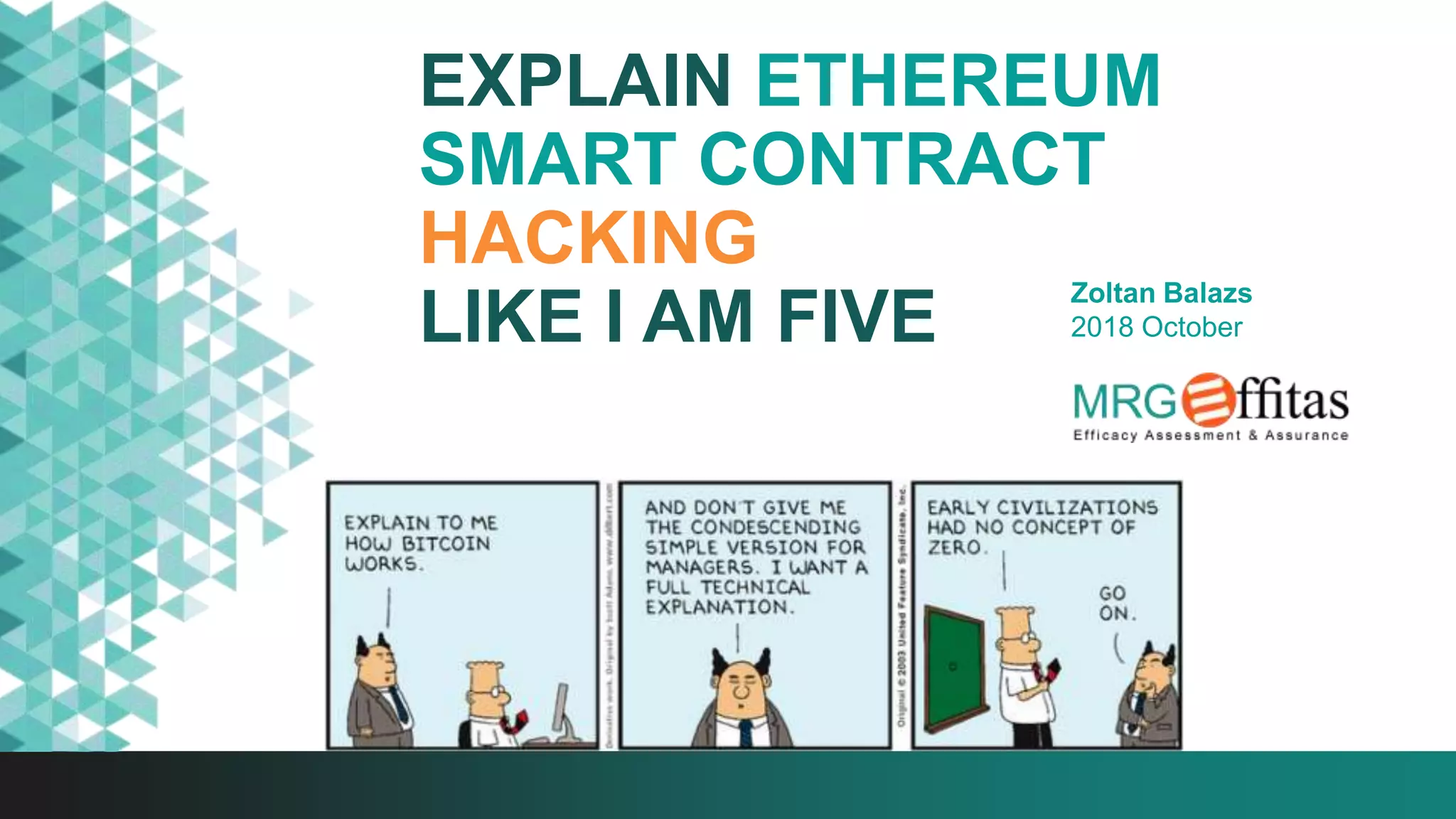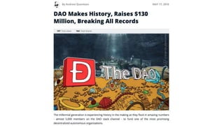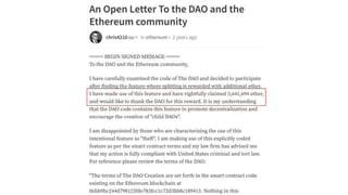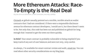 Ethereum allows for smart contracts which are programs stored on the blockchain that execute automatically based on predefined rules. Smart contracts are vulnerable to hacking through bugs and exploits like integer overflows. Major hacks have occurred on smart contracts, like The DAO hack which stole $50 million worth of ether. Writing secure smart contracts is challenging as seen through continued hacks, showing the technology is still immature.