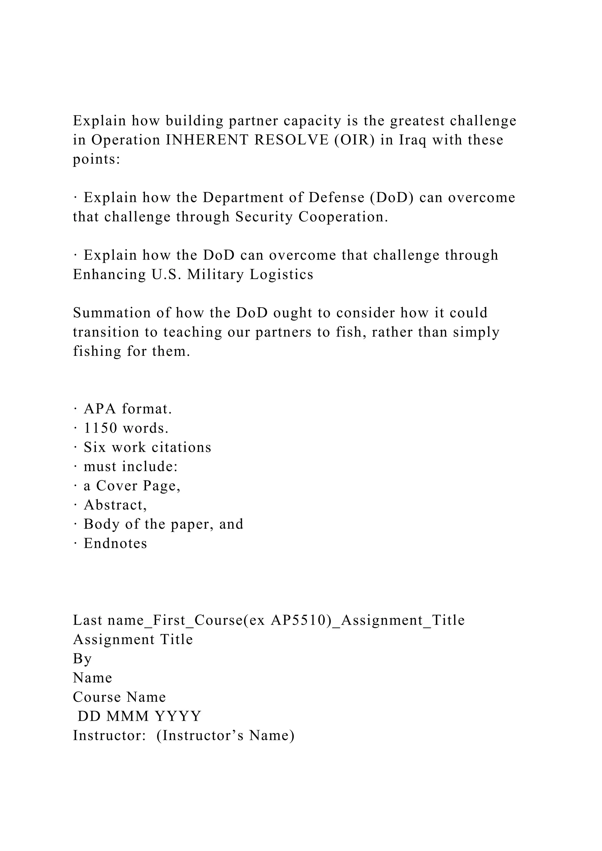 The document discusses the challenges of building military partner capacity in Iraq within the context of Operation Inherent Resolve, emphasizing the importance of logistics support for successful security cooperation. It outlines how the Department of Defense (DoD) can enhance this capacity through security cooperation and improved military logistics, advocating for a shift towards teaching partner nations self-sufficiency in logistics. The article highlights initiatives like the Logistics Capacity-Building Advisory Group to integrate logistics into security cooperation efforts, aiming to create effective and sustainable logistics systems among partner nations.