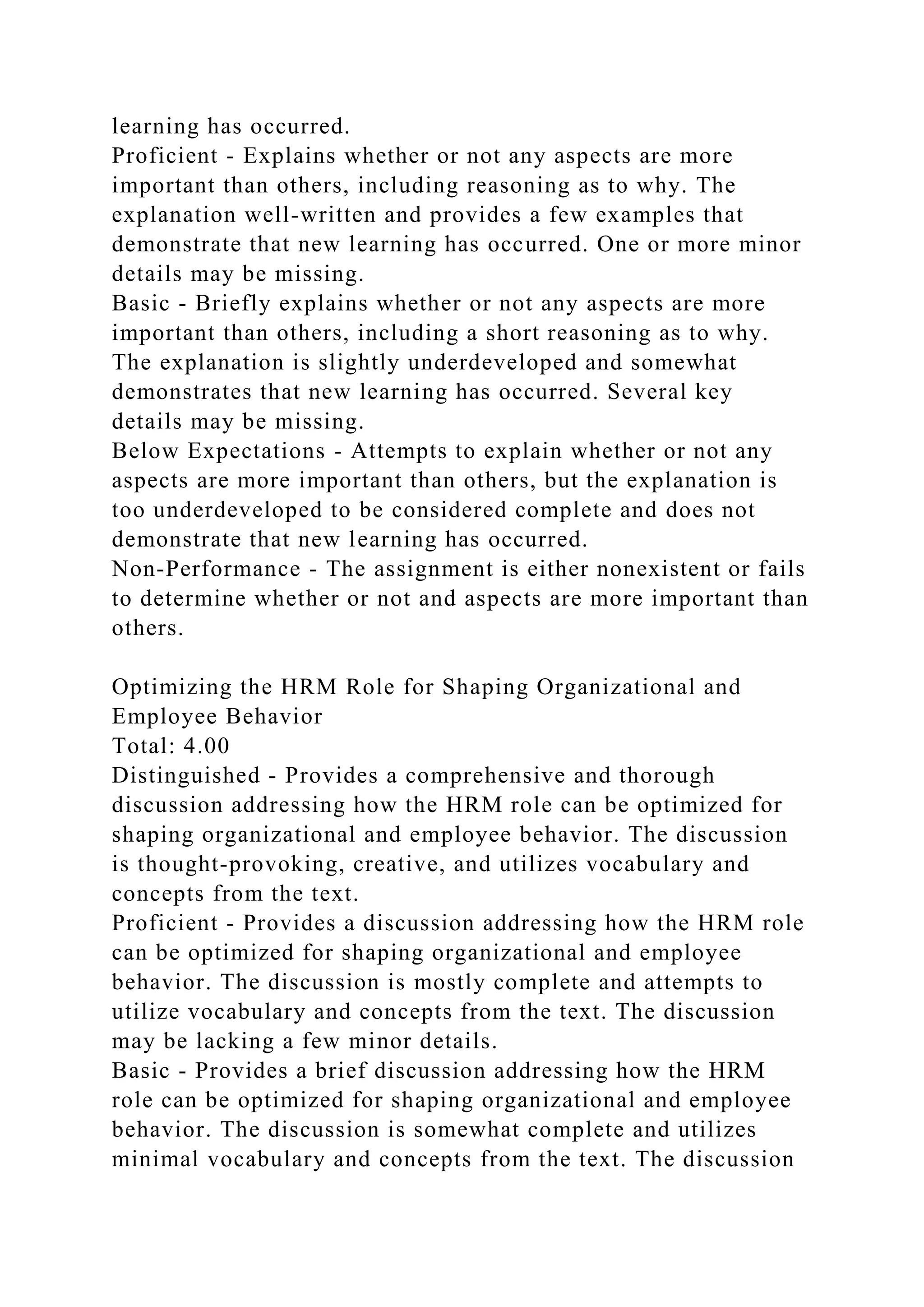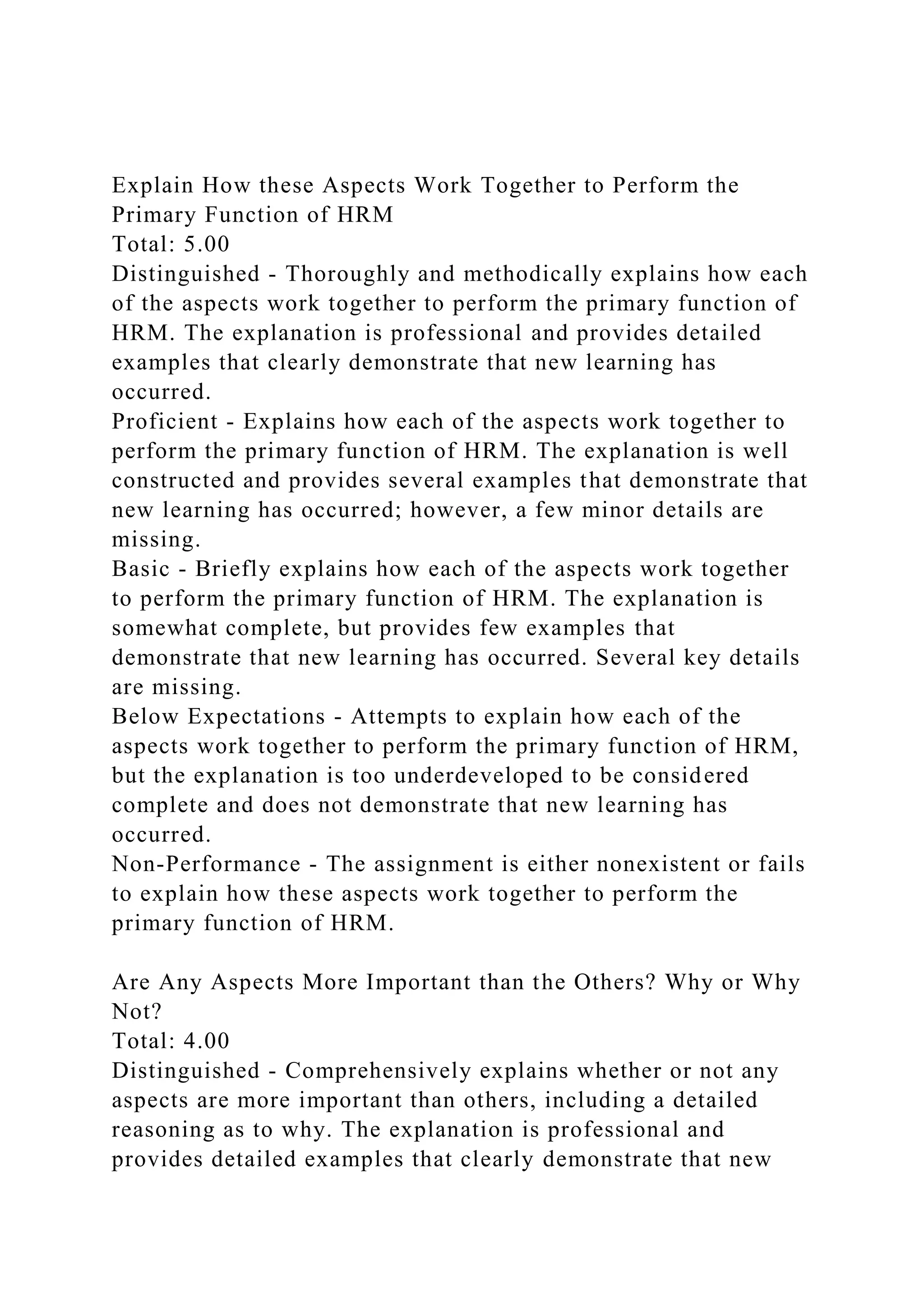 The document outlines the evaluation criteria for various aspects of Human Resource Management (HRM), including explanations of how these aspects work together, their importance, and optimizing HRM roles. It includes a detailed rubric ranging from distinguished to non-performance across categories such as organization, critical thinking, reading comprehension, written communication, APA formatting, page requirement, and resource requirement. Each level of achievement is described with specifics on what constitutes effective or ineffective performance in each area.