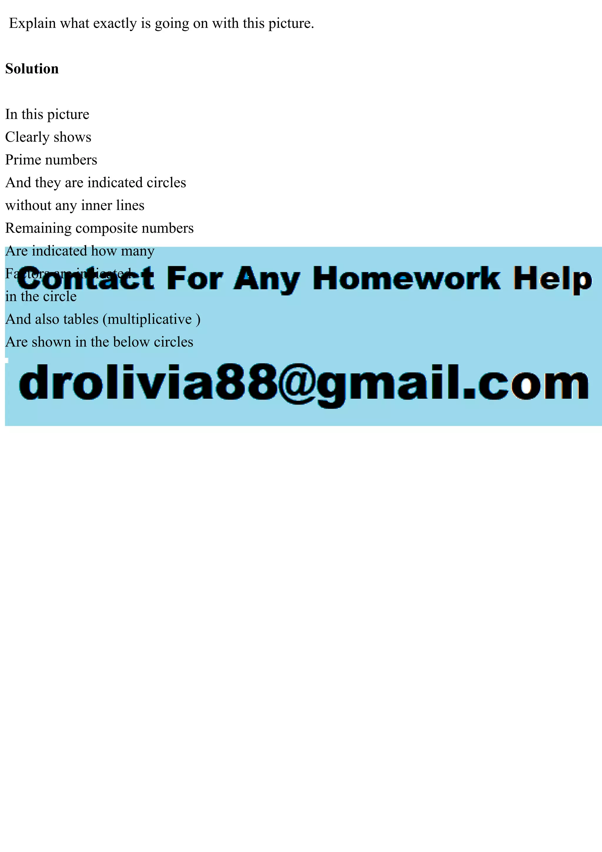 The document explains a picture that illustrates prime numbers, which are represented by circles without inner lines, while composite numbers are shown with factors indicated within the circles. Additionally, there are multiplicative tables displayed beneath these circles. This visual representation helps differentiate between prime and composite numbers.