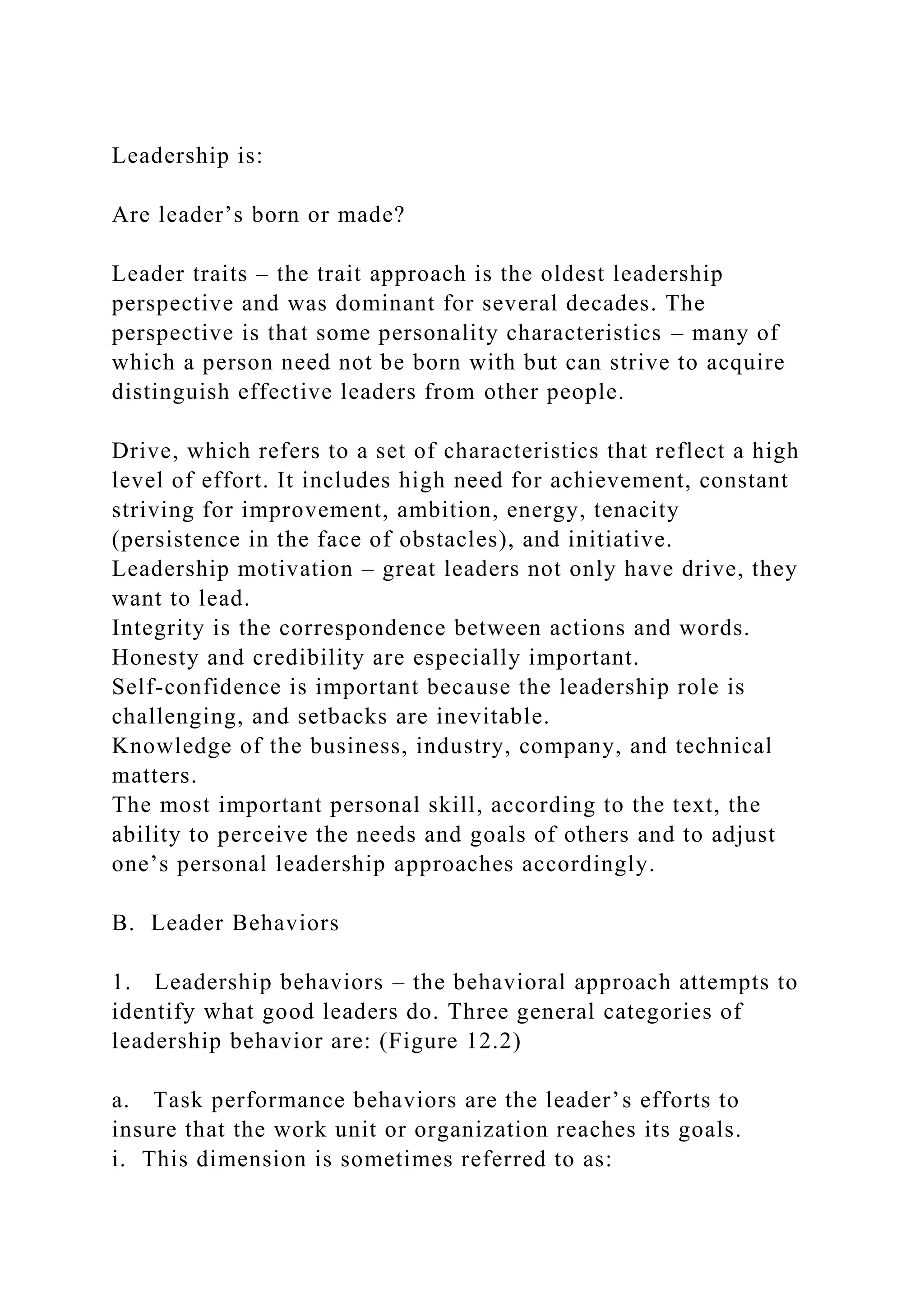 The document explores various leadership theories, emphasizing the traits and behaviors that characterize effective leaders, and delves into the distinction between leaders and managers. It discusses different leadership approaches, including trait, behavioral, and contingency theories, while highlighting the importance of adaptability in leadership. Additionally, it examines the impact of leader behaviors on follower motivation and overall organizational success.