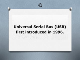 The document discusses USB 3.0, which has a maximum data transfer speed of 5 Gbit/s, about 10 times faster than USB 2.0. USB 3.0 uses a 5-contact plug connector compared to the 4-contact plug of earlier USB standards. Real-world tests showed USB 3.0 can transfer data much faster than USB 2.0.