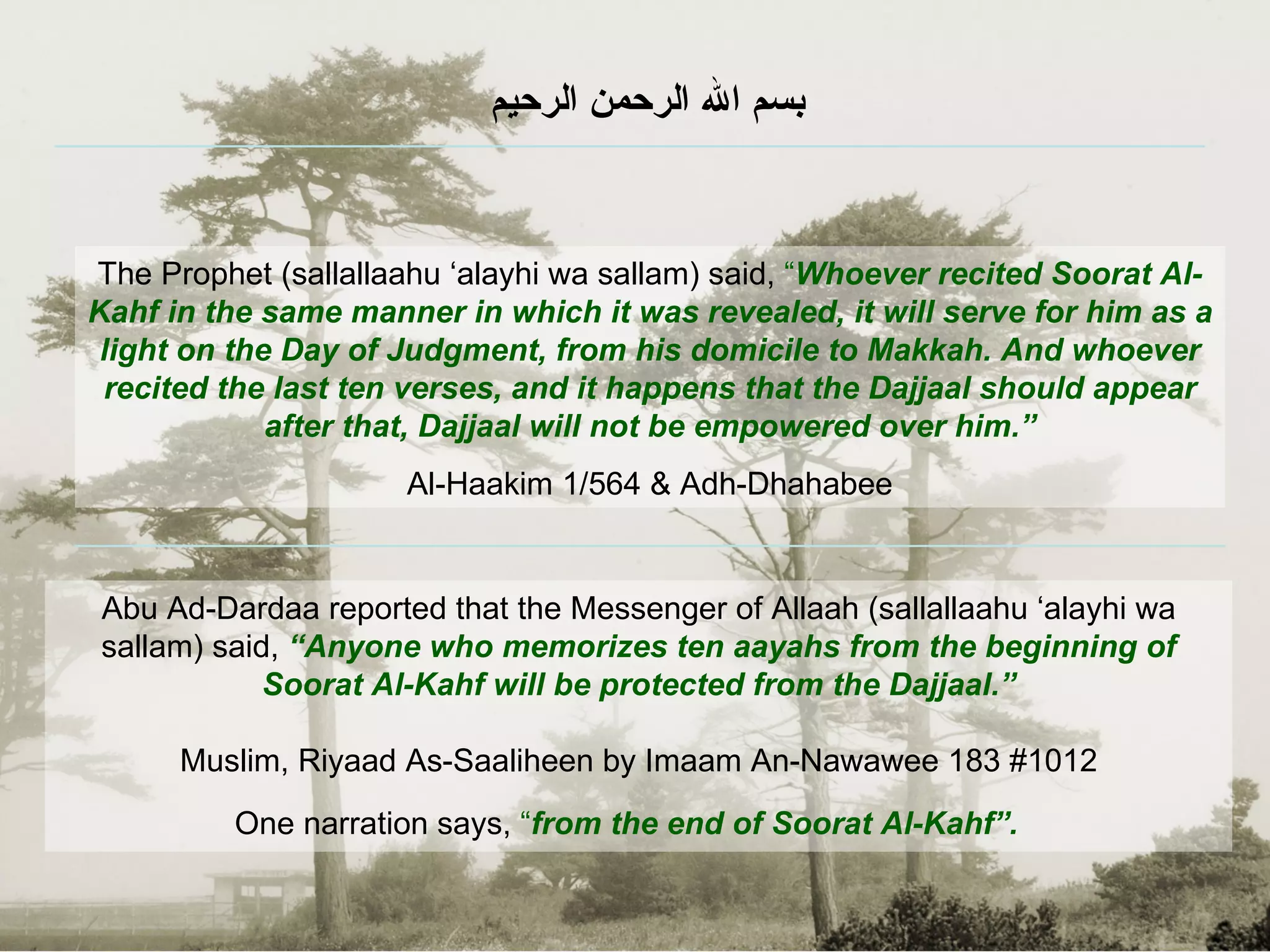 This document discusses the significance of Surah Al-Kahf from the Quran, emphasizing memorization and recitation as protections against the Dajjal, a figure who will challenge believers before the Day of Judgment. It outlines the four main trials that the Dajjal will present and highlights the importance of good companionship, humility, and sincerity in faith. Additionally, it encourages regular reading of the Surah, especially on Fridays, to maintain spiritual awareness and preparation against life's trials.