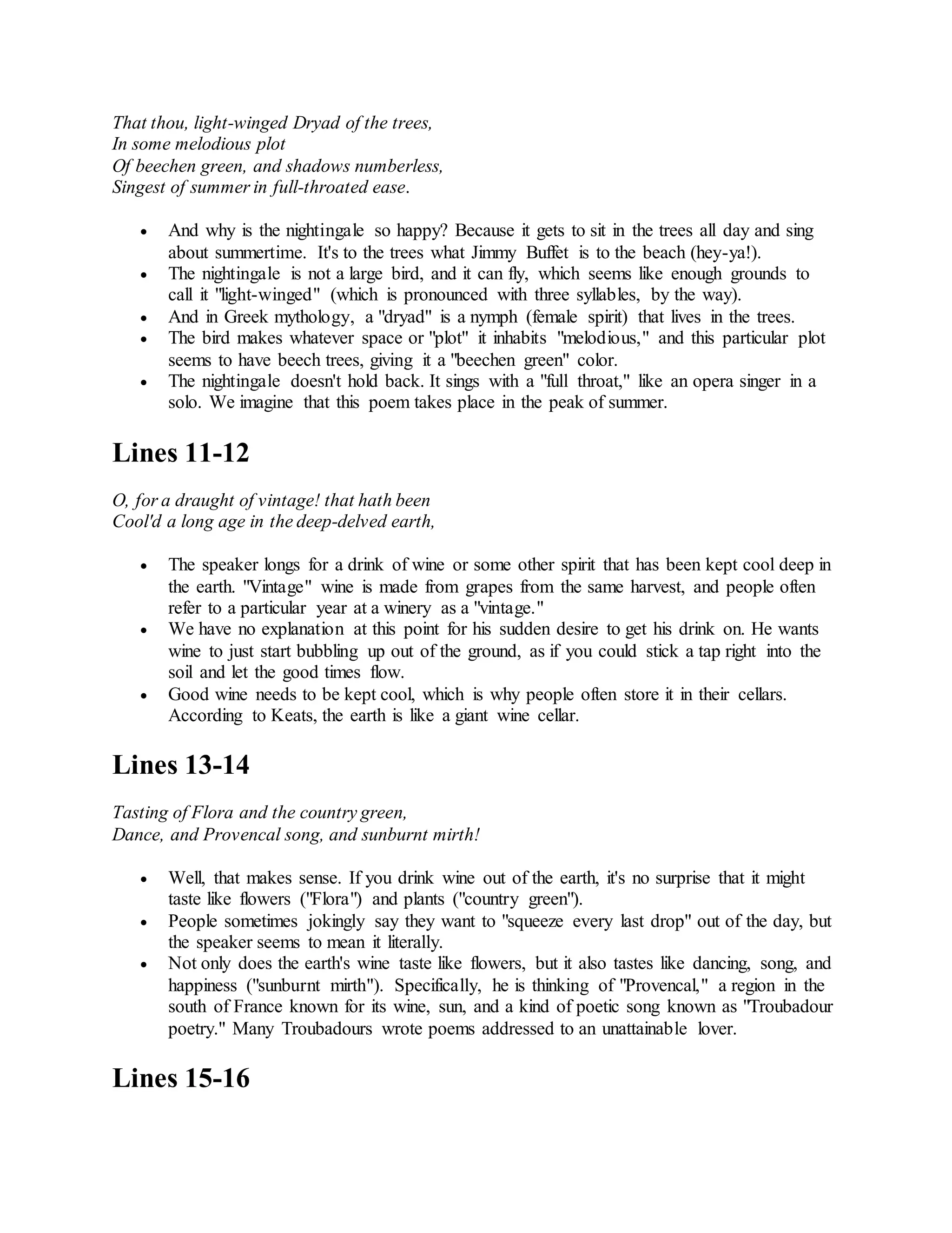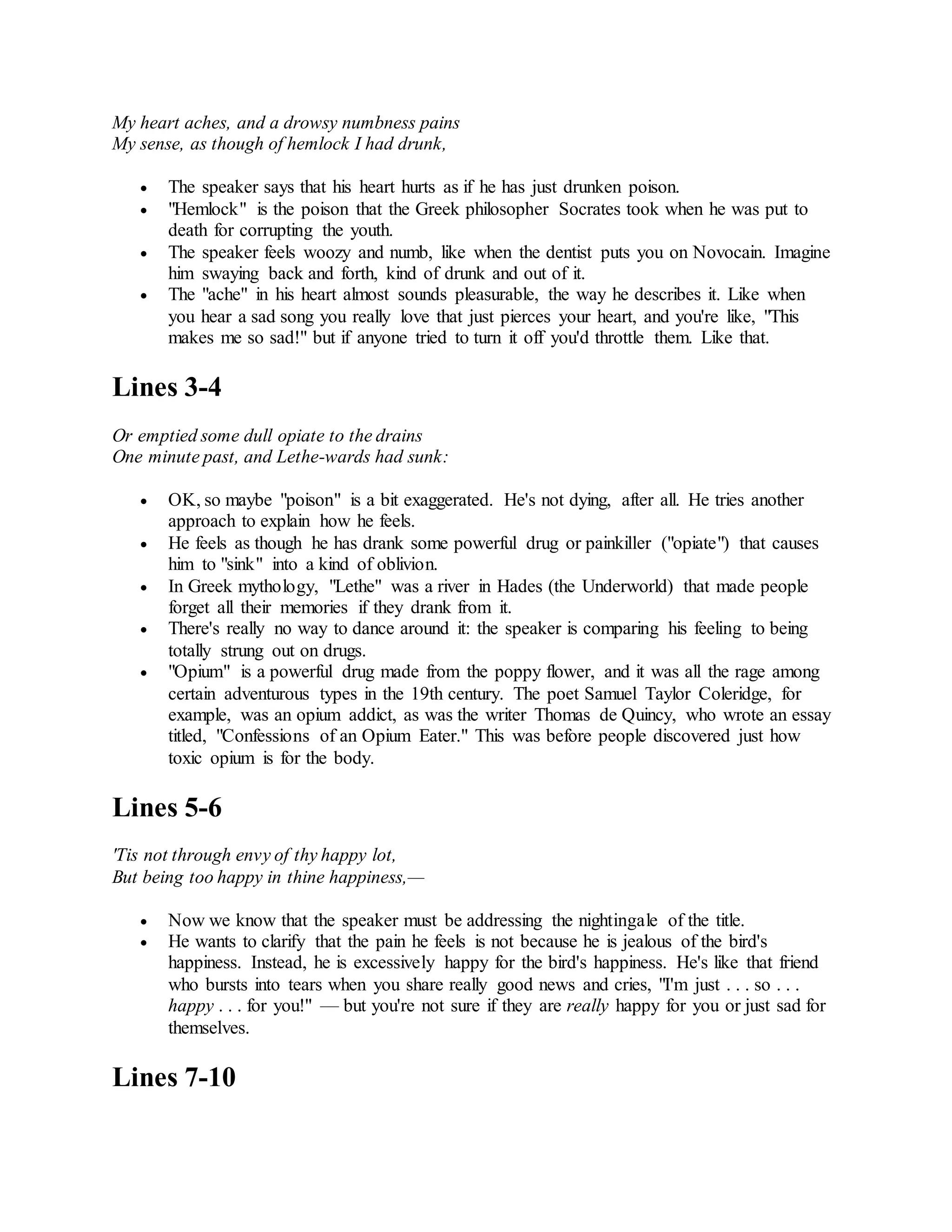 The speaker feels numb and woozy, as if he has taken poison or a powerful drug. He envies the nightingale, which sings happily in the forest without cares or worries. The speaker longs to forget his weariness with the world by drinking wine that would allow him to fade into the forest with the nightingale and escape humanity's troubles.