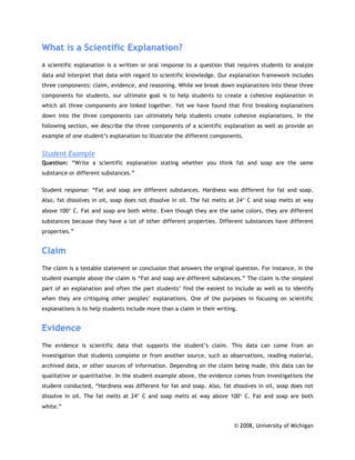 The document discusses the importance of scientific explanation in science education. It provides three reasons why explanation construction should be an important part of science class: 1) It reflects scientists' practices of constructing arguments and explanations, 2) It enhances students' understanding of the nature of science, and 3) It can improve students' understanding of science content. The document then describes the key components of a scientific explanation - the claim, evidence, and reasoning - and provides strategies to help students learn to construct explanations.
