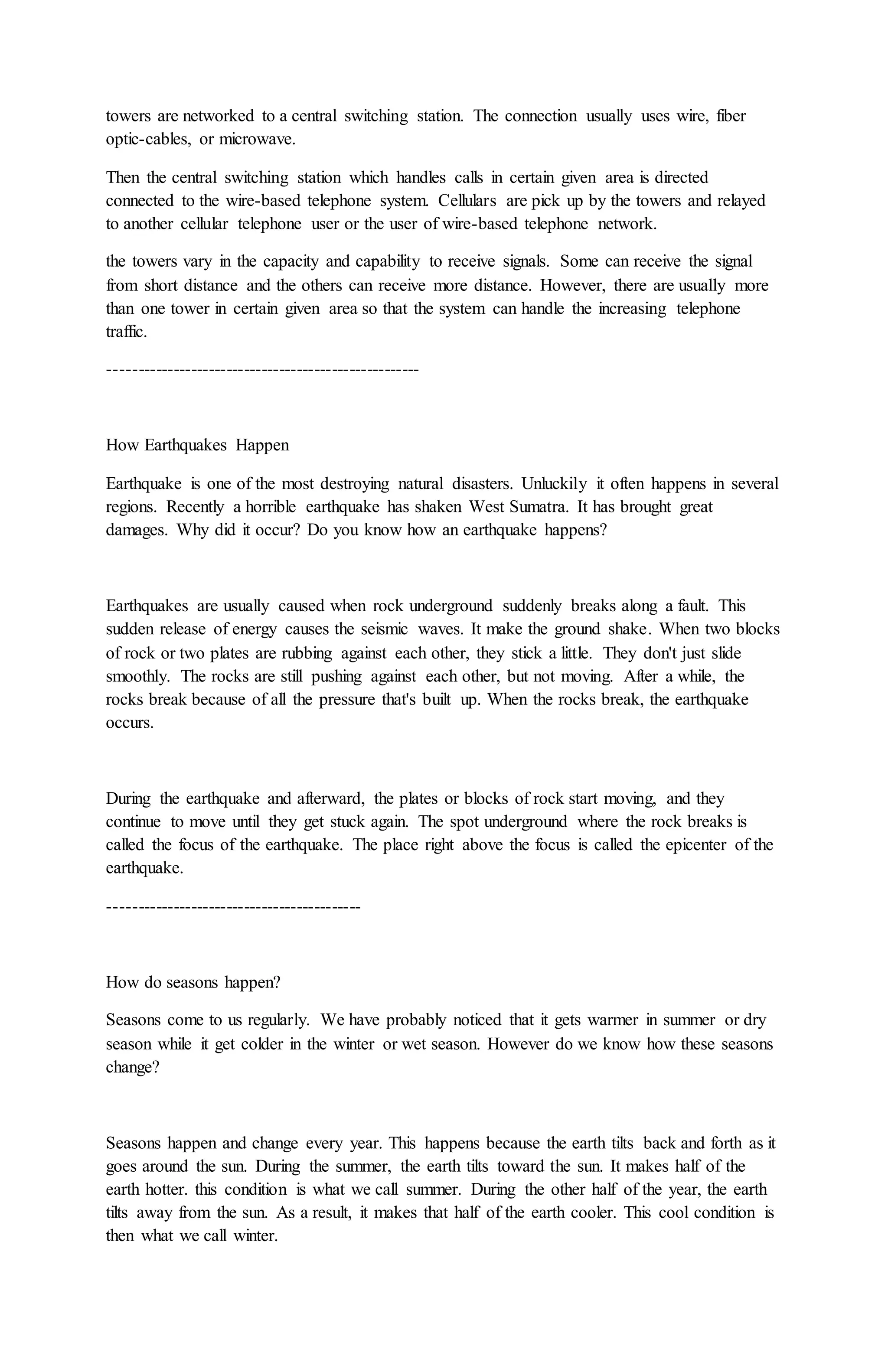 Rain occurs through the water cycle of evaporation and condensation. Water evaporates from Earth's surface due to heat from the sun, rises into the atmosphere as vapor, cools and condenses into liquid water droplets, and falls as precipitation like rain or snow. Some rain evaporates before reaching the ground, seen as virga in dry regions. Cell phones work by transmitting radio signals to cellular towers connected to switching stations and wired telephone networks to connect calls between mobile and other phones. Earthquakes happen when built-up pressure causes rocks underground to break suddenly along faults, releasing energy as seismic waves that shake the ground.