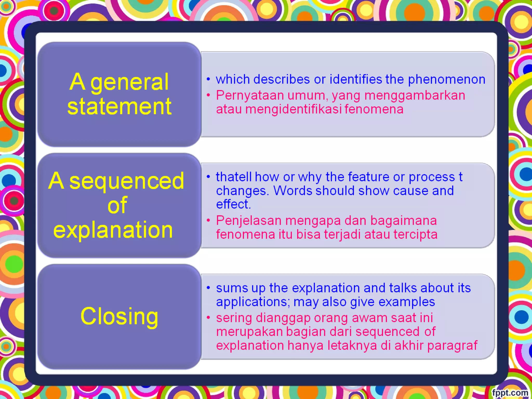 - Explanations tell the processes relating to natural, social, scientific, and cultural phenomena in order to describe how or why things occur.