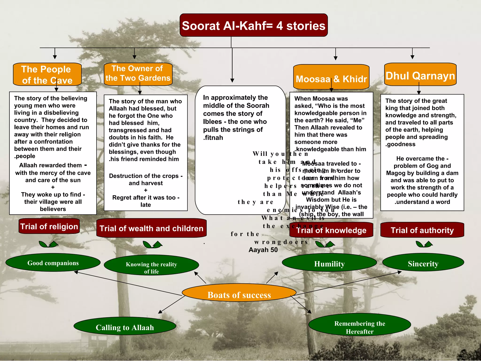 The document discusses Soorat Al-Kahf from the Quran and its importance in protecting against the Dajjaal. It mentions that the Prophet Muhammad said memorizing the first 10 verses or last 10 verses of Soorat Al-Kahf will protect one from the Dajjaal. Soorat Al-Kahf contains stories that relate to trials people will face, and reading it weekly can help one understand and avoid these trials.