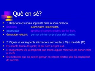 Què en sé?1.Relaciona els noms següents amb la seva definció. Bombeta subministra l’electricitat. Interruptor aprofita el corrent elèctric per fer llum. Generador elèctric permet o interromp el pas del corrent. 2. Digues si les següents afirmacions són veritat ( V) o mentida (M) Els imants tenen dos pols; el pol nord i el pol sud. El magantisme és la propietat que tenen alguns materials de donar calor al medi Els materials que no deixen passar el corrent elèctric són els conductors de corrent.