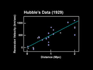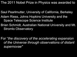 The document discusses the accelerating expansion of the universe, highlighting the contributions of Nobel laureates Saul Perlmutter, Adam Riess, and Brian Schmidt to our understanding of this phenomenon through observations of distant supernovae. It covers various methods for measuring astronomical distances, especially the role of standard candles such as type Ia supernovae and their significance in validating Hubble's law. Additionally, the document outlines the life cycles of stars and how they ultimately lead to stellar phenomena that illuminate our understanding of cosmic expansion and dark energy.