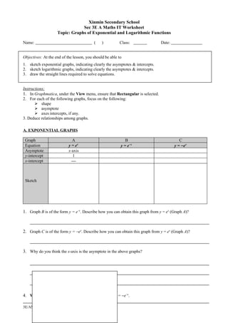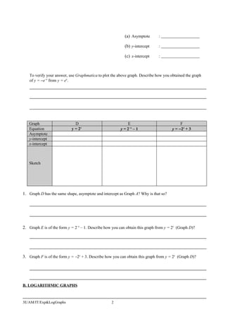 1. The document provides instructions for sketching exponential and logarithmic graphs. Students are asked to sketch various graphs of exponential and logarithmic functions, noting the shape, asymptotes, and intercepts.