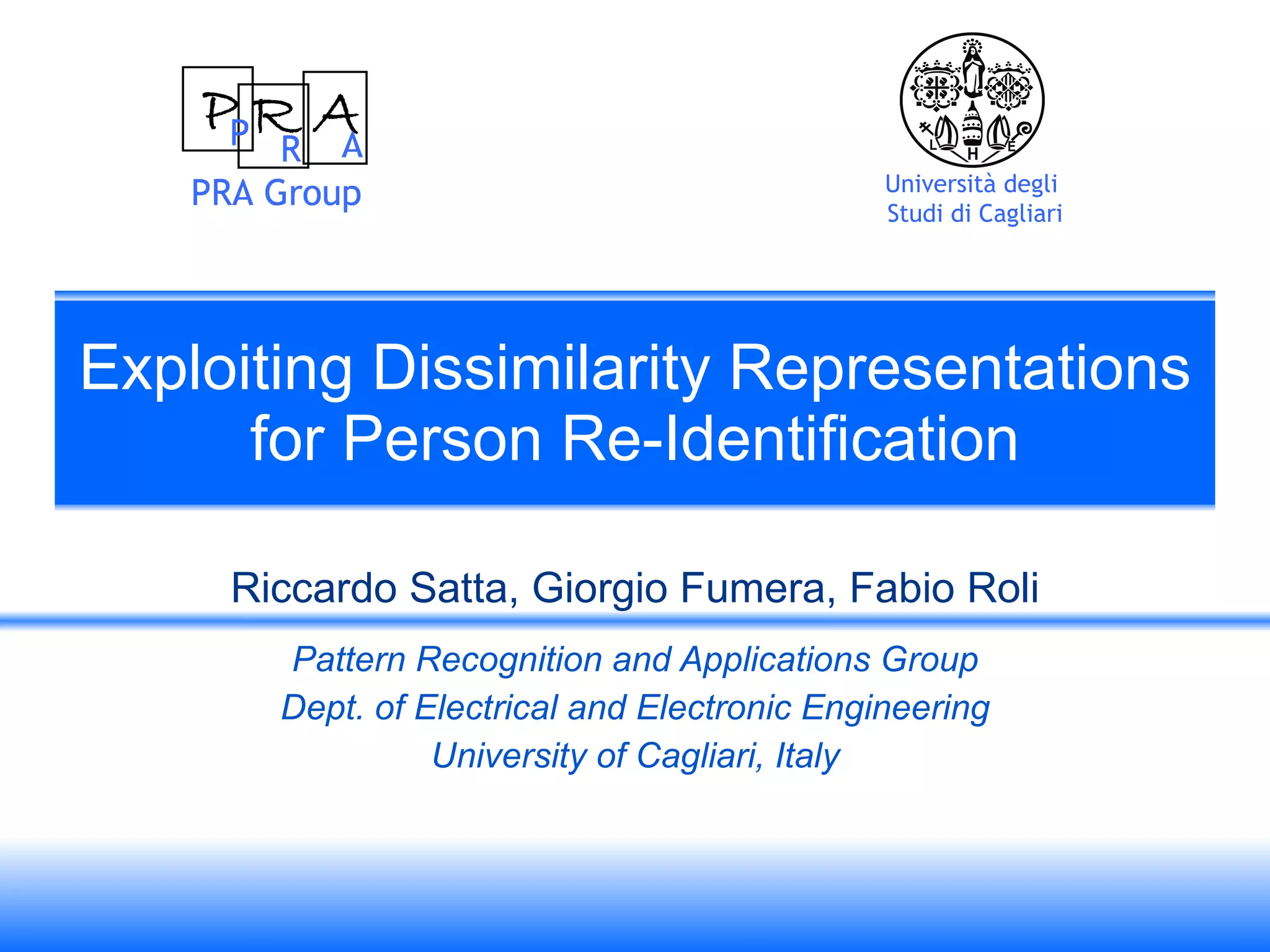 The document discusses person re-identification through dissimilarity representations. It proposes representing each person as a vector of dissimilarity values compared to visual prototypes, rather than traditional descriptors. This reduces storage requirements and allows extremely fast matching. The Multiple Component Dissimilarity framework is presented, which defines prototypes, and represents templates and queries as dissimilarity vectors for efficient matching in the dissimilarity space. Preliminary experiments applying this framework to a specific method show improvements in computational time and storage over the original method.