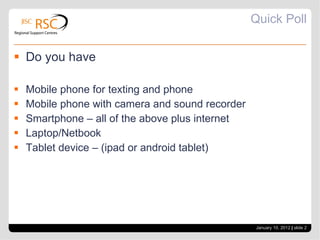 The document discusses exploiting learner mobile devices for teaching and learning opportunities. It notes that most learners now have mobile phones or smartphones and use them frequently. While there are some concerns about devices being distracting or privacy issues, there are also opportunities to make materials mobile-friendly and encourage flexible and creative learning. Some specific strategies mentioned include using polling apps, videos, and images in the classroom as well as managing device use through clear rules.