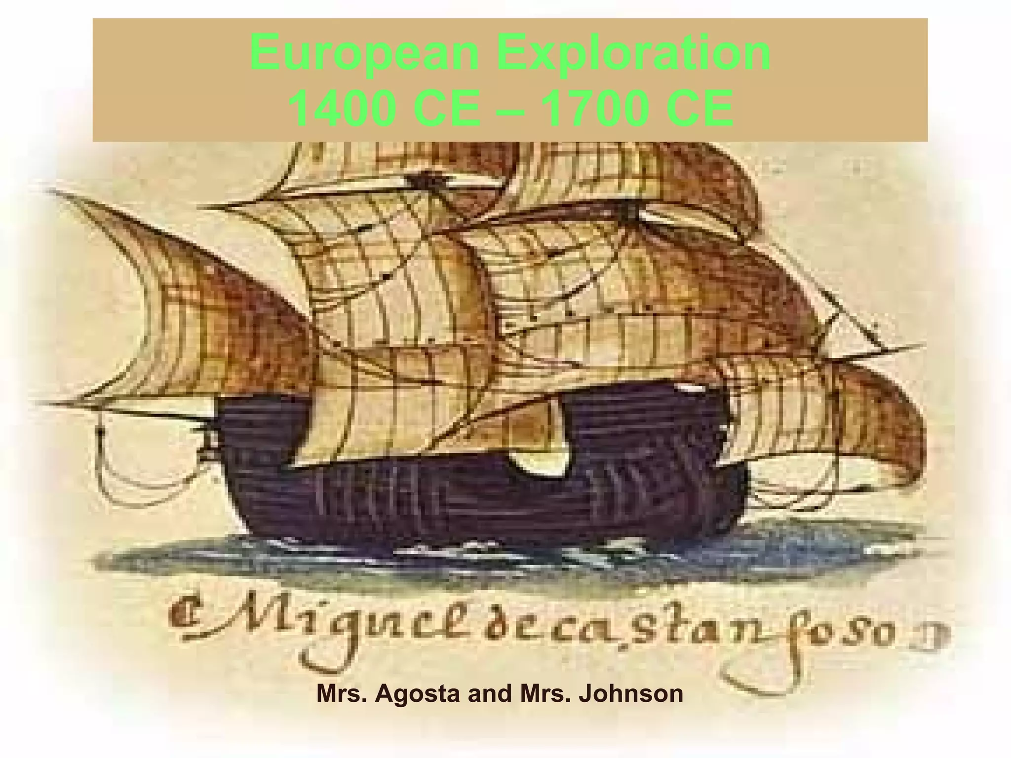 European exploration between 1400-1700 CE was driven by several key factors: the questioning spirit of the Renaissance; the search for a better trade route to Asia to access spices at cheaper prices by cutting out Muslim and Italian middlemen; the desire of Christian missionaries to spread Christianity; and technological improvements like Guttenberg's printing press and advances in navigation that enabled more ambitious voyages.