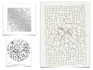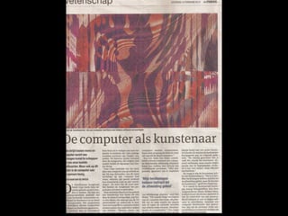 This document summarizes Eelco den Heijer's presentation on creative coding. It discusses different forms of creativity such as combinational, exploratory, and transformational creativity. Examples of creative coding projects are presented, including EvoArt which uses genetic programming to create evolutionary art, Arfunkel which uses functional programming to manipulate images, and Dichtfabriek which generates poetry using word sequences. Live coding is also discussed as a way to produce and perform code simultaneously. The presentation concludes that creative coding comes in many forms and is an enjoyable way to be creative with technology.
