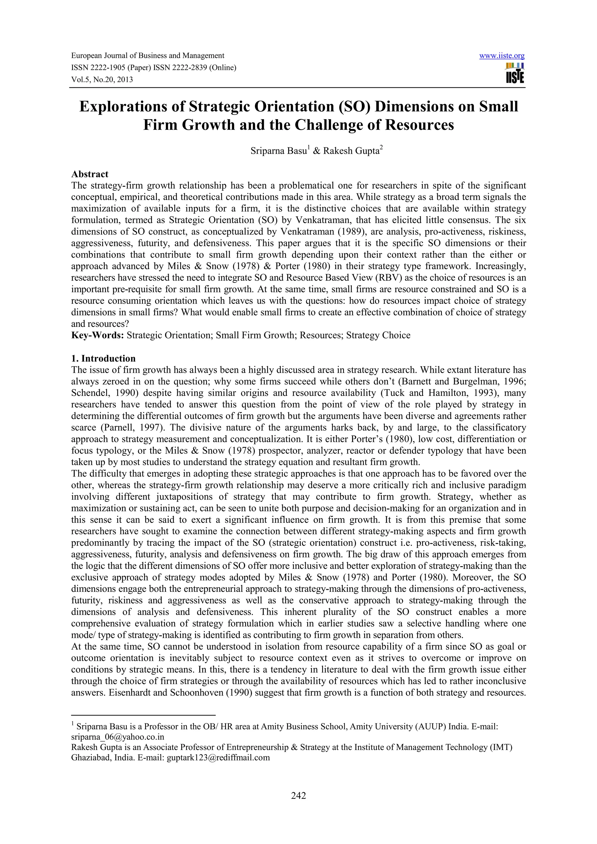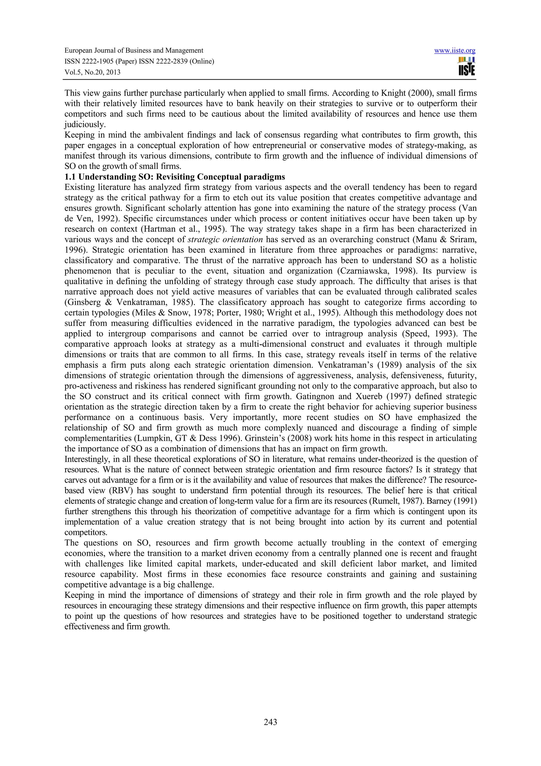 The document explores how the six dimensions of SO (analysis, proactiveness, riskiness, aggressiveness, futurity, and defensiveness) may individually or combined contribute to small firm growth, and how a firm's resources may moderate this relationship. It also discusses how both entrepreneurial and conservative strategic orientations through various SO dimensions can promote growth at different stages, but that resource constraints make strategy choice more important for small firm performance. The paper argues that understanding the interaction between SO dimensions, resources, and growth is needed to assess strategic effectiveness for small firms.