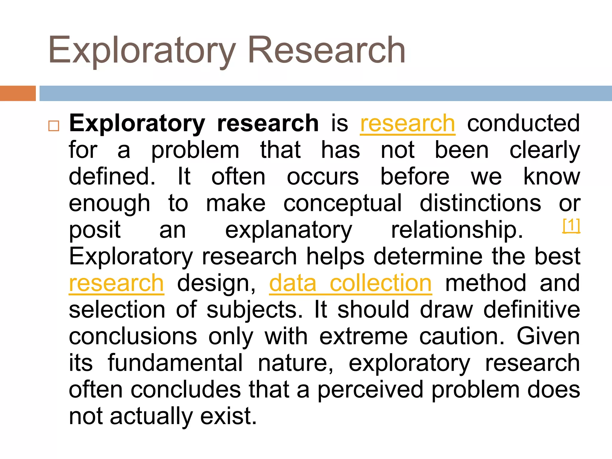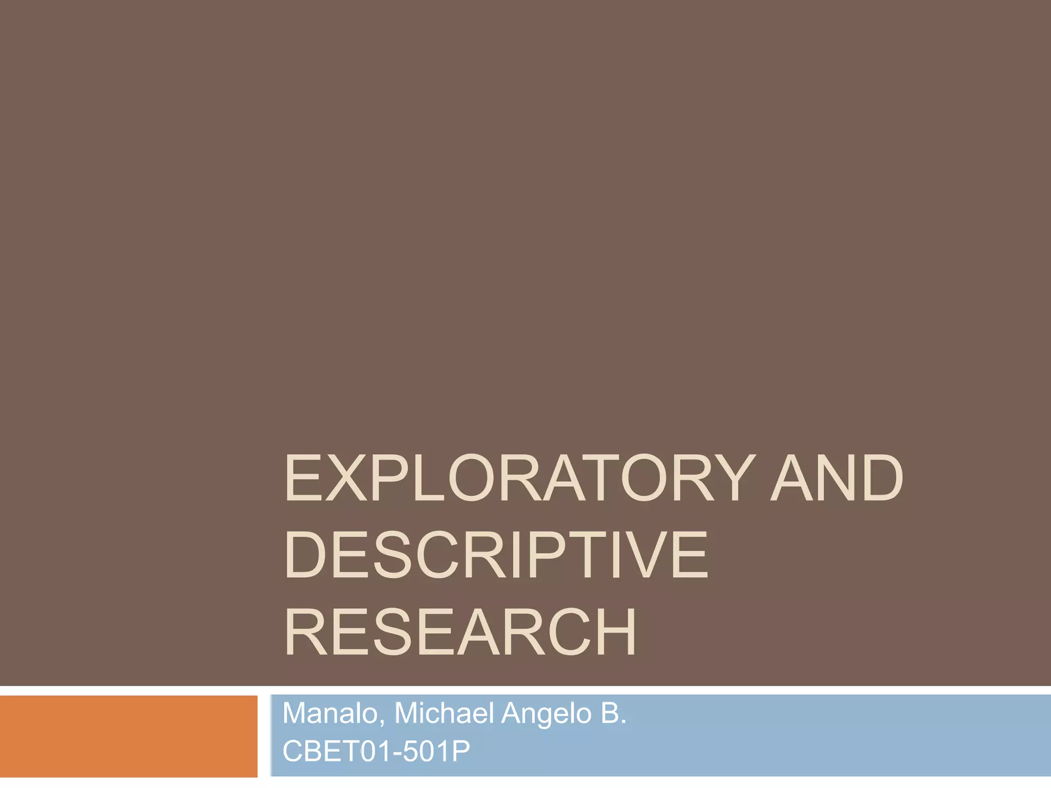 This document discusses exploratory and descriptive research. Exploratory research is conducted when a problem is not clearly defined, and helps determine the best research design. It aims to satisfy curiosity, test feasibility of further study, and develop methods. Descriptive research describes characteristics of a population or phenomenon, addressing the "what" question. It observes, describes, and documents aspects of a situation naturally occurring through questionnaires, interviews, and observation. Both research types draw only cautious conclusions given their fundamental nature.