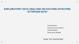 This document analyzes factors affecting employee attrition using exploratory data analysis. It explores various continuous and categorical variables in the dataset including age, income, job satisfaction, work-life balance, department, and more. For each variable, it provides statistics like means, medians and distributions. Key findings are that attrition is higher for younger employees, those with lower income or job level, less satisfaction, imbalance in work-life, and frequent business travel. Marital status and gender also influence attrition but not significantly.