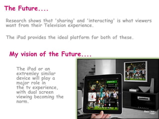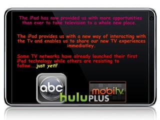 The document discusses two links related to media platforms. The first link is to ABC's player for the iPad, suggesting the document relates to digital media consumption. The second link references Nielsen Media Sync, a platform that measures cross-platform media usage and behavior. In summary, the document contains links about digital media platforms for viewing content and analyzing cross-device usage.