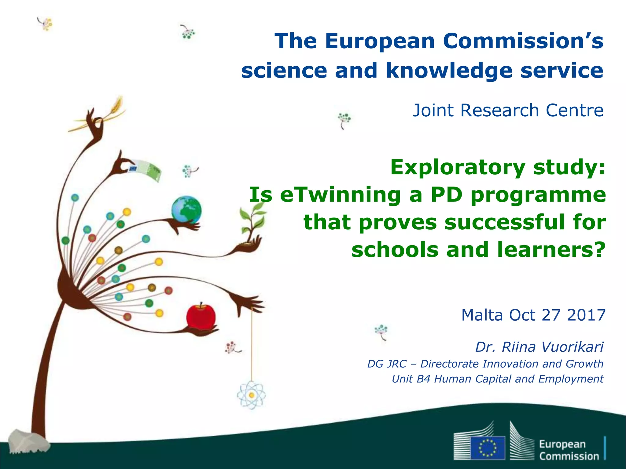 The European Commission's Joint Research Centre conducted an exploratory study to assess eTwinning as a professional development program for schools and learners, focusing on how digital trace data can inform research evidence for policy-making. The study aims to evaluate the impact of eTwinning on teacher professionalism, collaboration, and student outcomes through a structured methodology. It seeks collaboration and insights from stakeholders involved in similar research to enhance understanding and support educational innovation.
