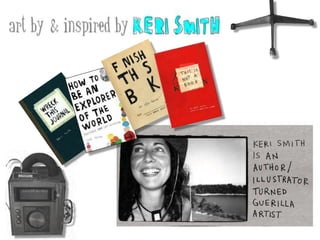 The document discusses exploratory testing and Keri Smith. It provides an overview of exploratory testing, noting that it emphasizes personal freedom and responsibility of testers to continually optimize testing. It also discusses Keri Smith's work in conceptual art and guided journals that encourage observing the world like artists and scientists.