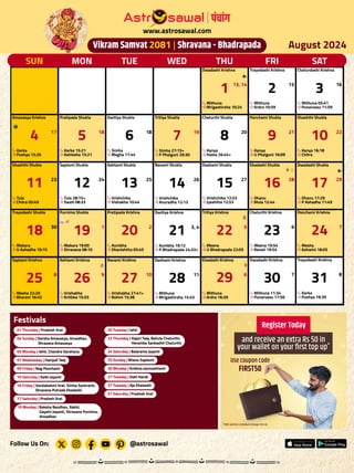 The document provides a detailed calendar of significant Hindu festivals and rituals occurring in August 2024, including dates and specific events such as Pradosh Vrat, Raksha Bandhan, and Krishna Janmashtami. It also includes specific timings for different lunar phases and astrological events. Additionally, it lists various social media links and resources related to the Astro Sawal platform.