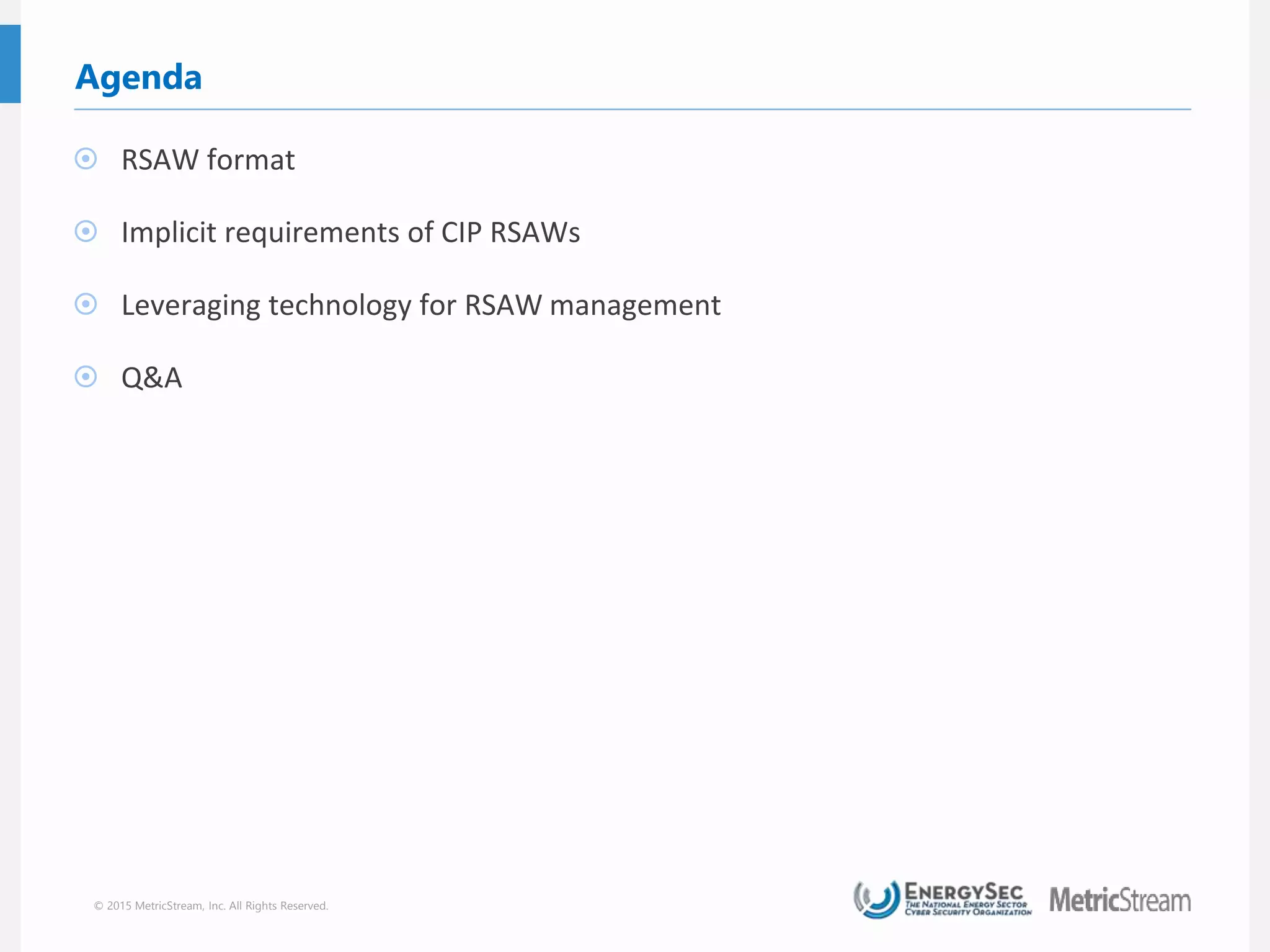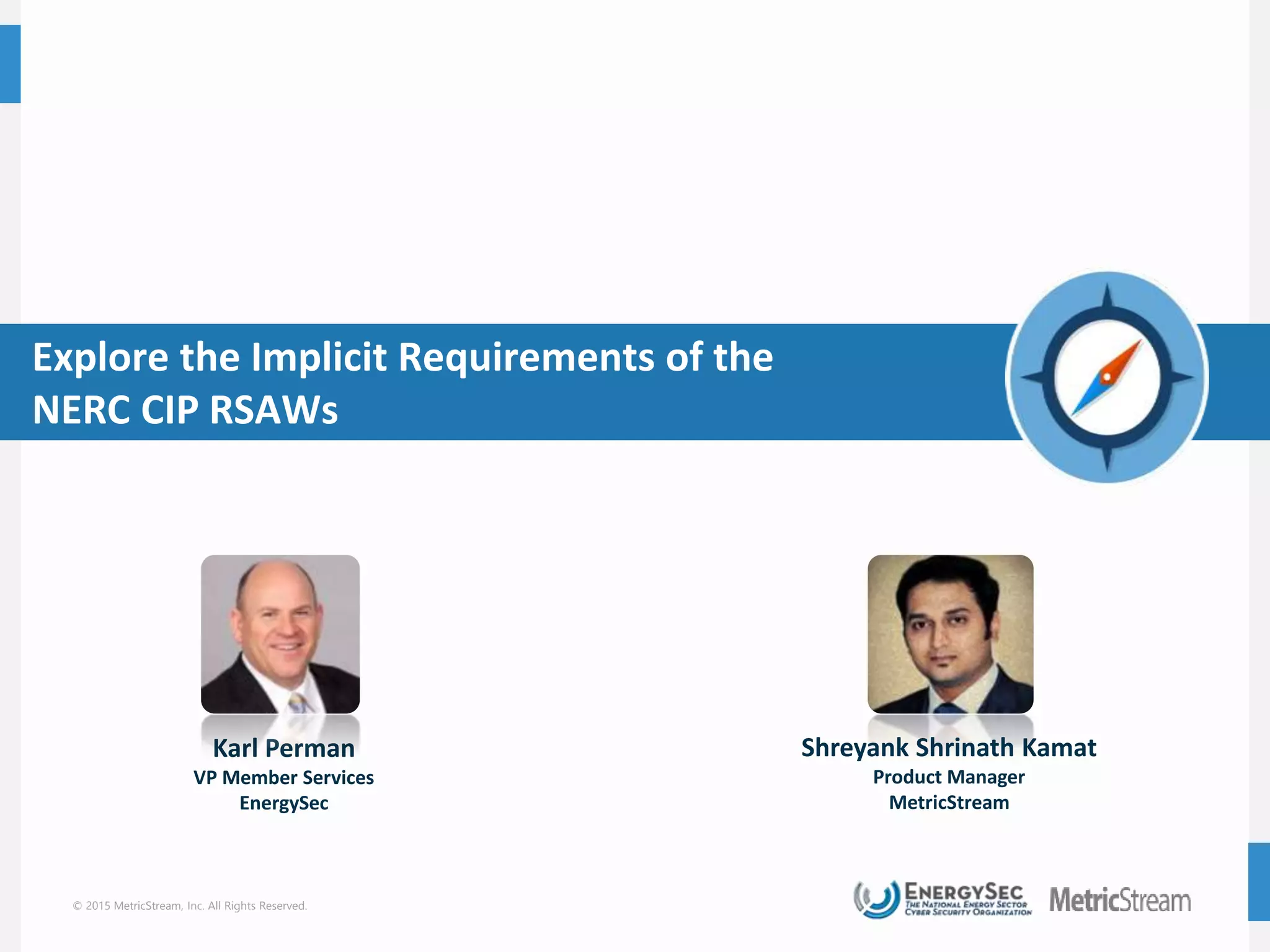 The document discusses the implicit requirements of the NERC CIP RSAs and outlines the RSaw template and its key components, including identifying information, compliance narratives, and auditor questions. It emphasizes the need for documenting processes related to cyber asset management, including the classification of assets, shared compliance responsibilities, and maintaining compliance with policies. The presentation also details the benefits of leveraging technology for RSaw management and MetricStream's NERC CIP compliance solutions.