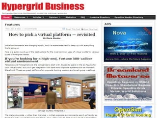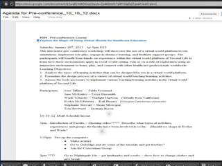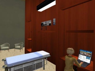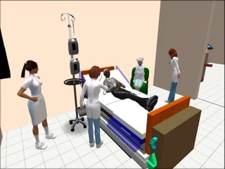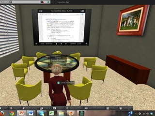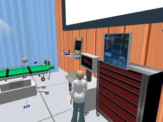 This document discusses using virtual worlds as an innovative teaching/learning strategy for healthcare professionals. It begins by outlining three learning objectives related to analyzing learning activities, designing virtual world activities, and assessing tools for implementation. Several types of learning activities that can be designed for virtual worlds are then described, including medical simulations, education sessions, support groups, and community health activities. Examples of specific virtual world platforms and activities used at various institutions are provided. The document concludes by discussing considerations and available resources for designing and implementing virtual medical simulations.