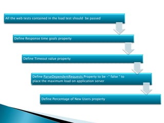 This document discusses configuring network settings and load profiles for web tests in Visual Studio Team Services (VSTS). It recommends selecting a network type, using a constant load profile with a high user count, and setting parameters like sample rate, connection pool size, and connections per user to closely model real browser behavior during load testing.