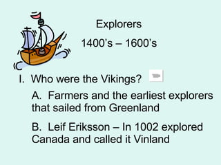 The document summarizes key early explorers from the 1400s-1600s who sought routes to Asia by sea. It discusses the Vikings including Leif Eriksson who explored Canada and called it Vinland in 1002. It also discusses Marco Polo who established overland trade routes to Asia through his travels from Europe to Asia from 1261. Europeans wanted to find a water route to Asia because land travel became dangerous and kings were willing to pay sailors. Christopher Columbus asked Spain for ships in 1492 and claimed the Bahamas for Spain, while Giovanni Da Verranzano explored New York Bay for France in 1524 but never landed due to hostile Native Americans.