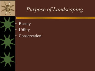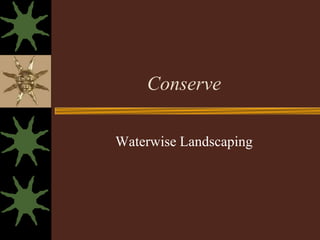The document discusses waterwise landscaping approaches like zeroscaping and xeriscaping that focus on conservation. Both approaches use rocks and sparse drought-resistant plants that rely on rainwater or limited watering to reduce water usage for landscaping. They provide beauty and utility while conserving a precious resource.
