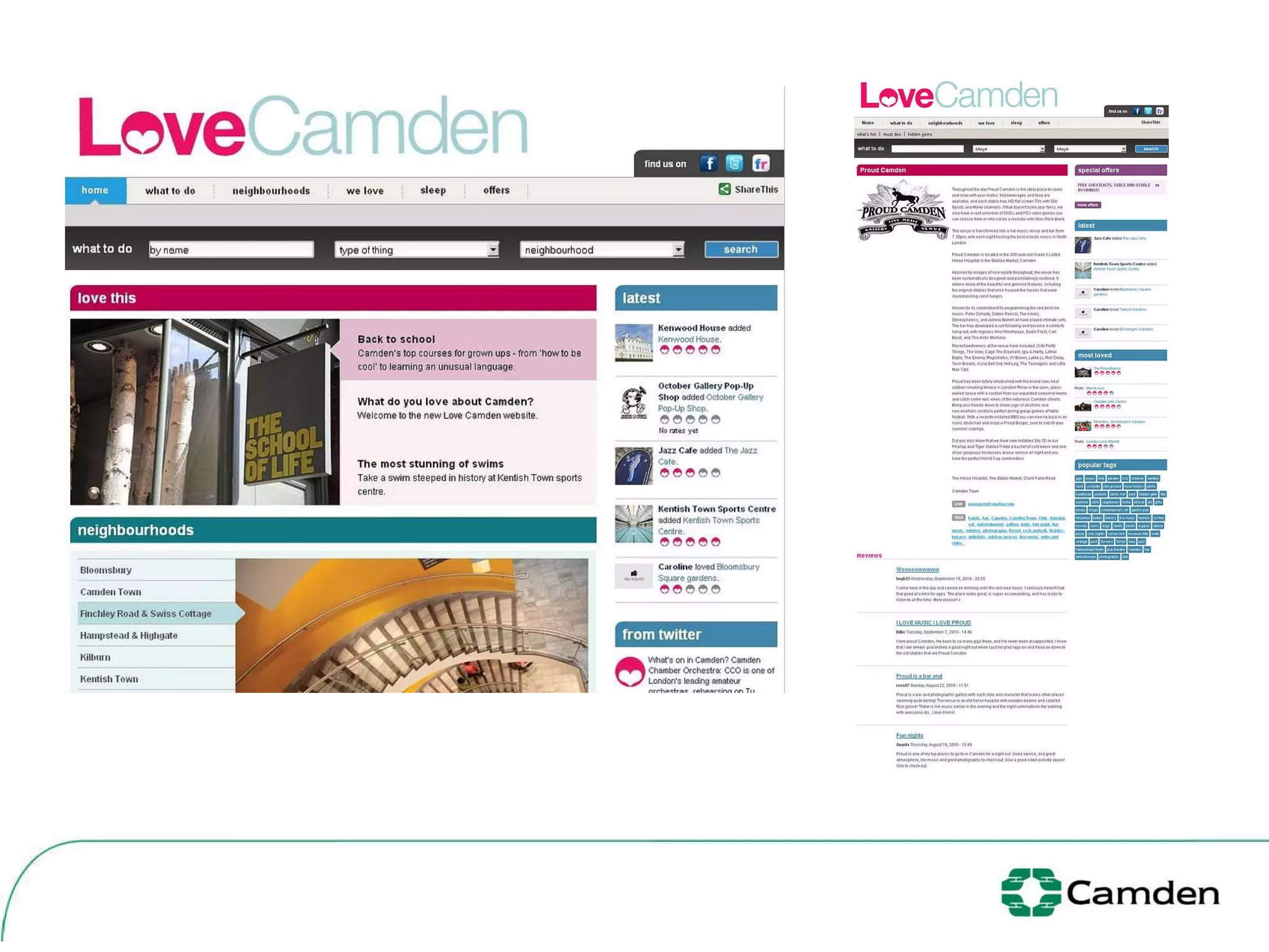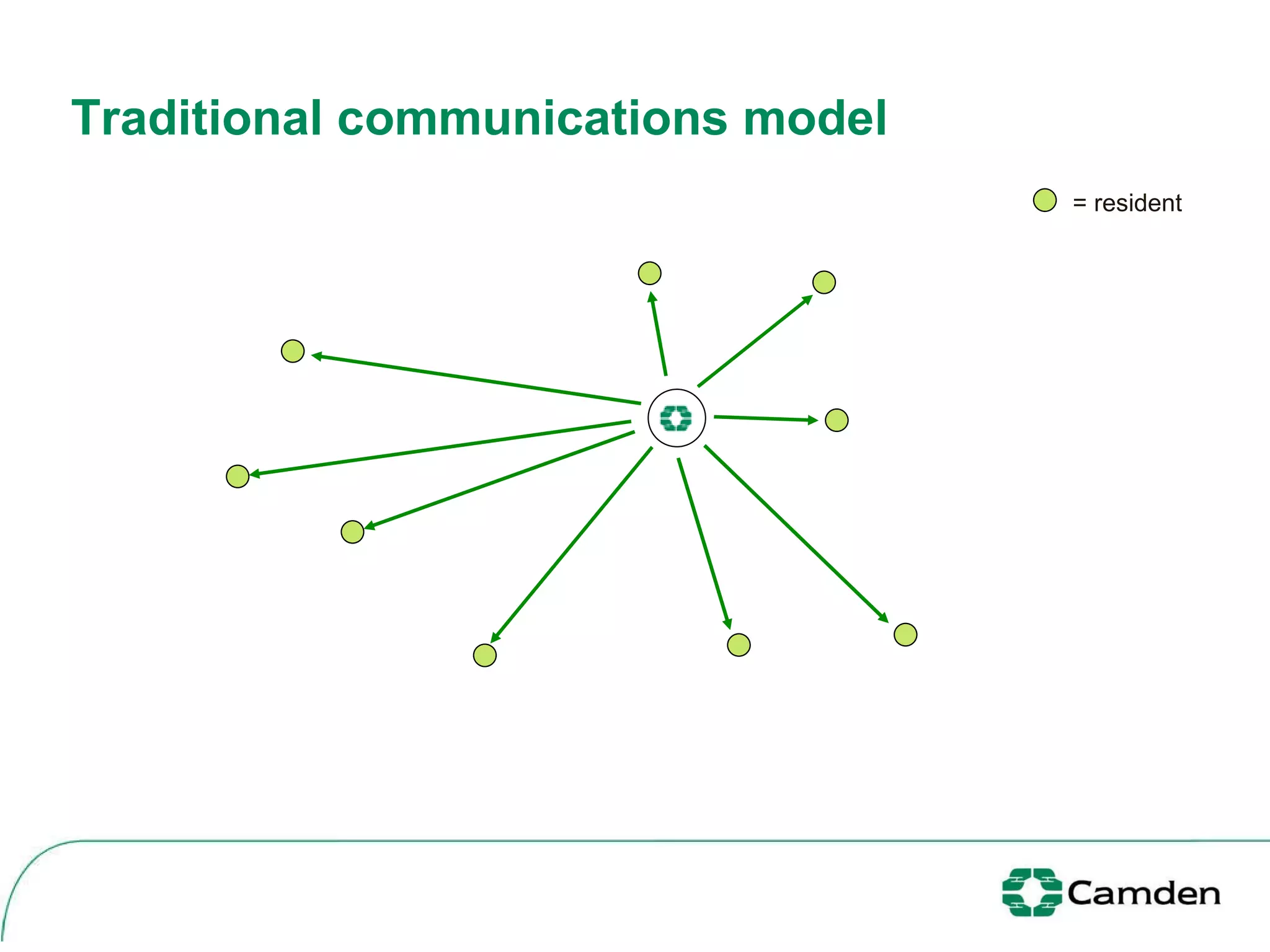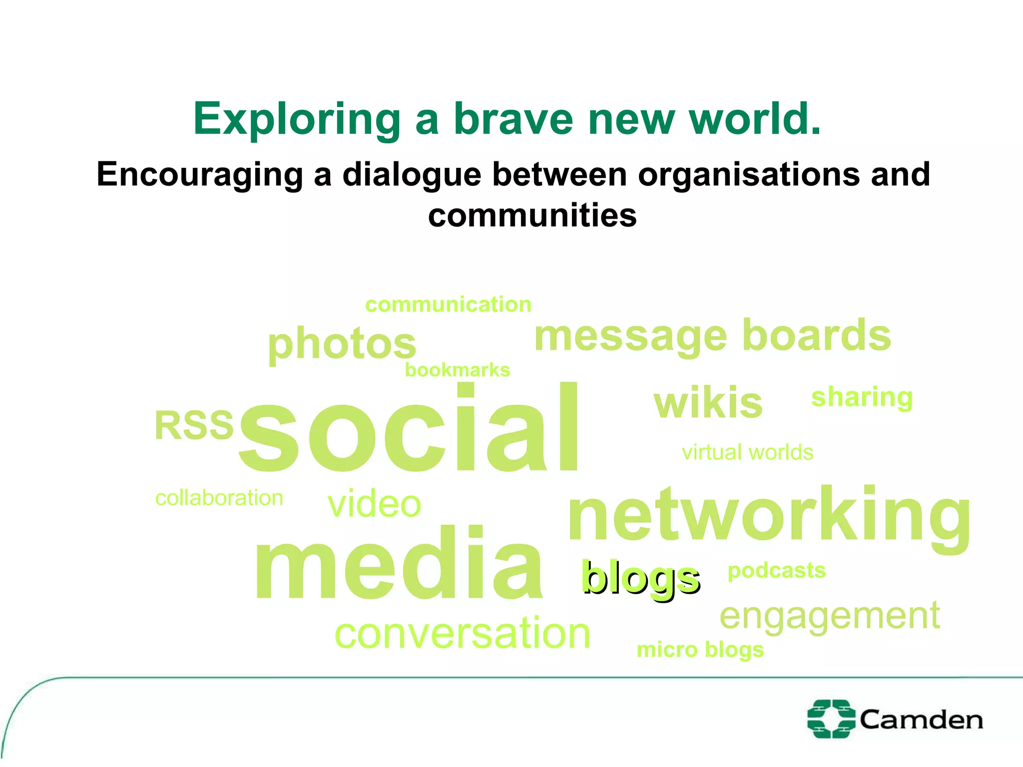 The document discusses Camden's initiatives to enhance community engagement through digital platforms and social media, aiming to empower citizens and transform service delivery. It outlines projects like CamdenVotes and WeAreCamden, which focus on increasing voter participation and fostering online communities, respectively. Additionally, it identifies challenges such as IT policy restrictions and the need for a clear social media policy to ensure effective implementation.