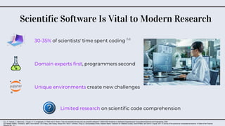 This presentation explores code comprehension challenges in scientific programming based on a survey of 57 research scientists. It reveals that 57.9% of scientists have no formal training in writing readable code. Key findings highlight a "documentation paradox" where documentation is both the most common readability practice and the biggest challenge scientists face. The study identifies critical issues with naming conventions and code organization, noting that 100% of scientists agree readable code is essential for reproducible research. The research concludes with four key recommendations: expanding programming education for scientists, conducting targeted research on scientific code quality, developing specialized tools, and establishing clearer documentation guidelines for scientific software.