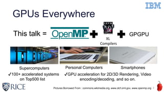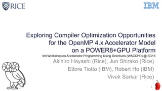 The document discusses optimizing OpenMP 4.x accelerator model performance for Power8+GPU platforms, highlighting the challenges in bridging the gap between application domain experts and hardware capabilities. It presents insights on minimizing runtime overheads, utilizing read-only cache effectively, and enhancing mathematical function generation, while emphasizing the importance of high-level loop transformations. The paper aims to explore compiler optimizations through detailed performance analyses and proposes future directions for research in high-level restructuring of OpenMP programs.