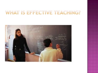 The document discusses effective teaching strategies for mathematics instruction. It provides quotes emphasizing the importance of teaching and lists research-backed instructional techniques. These include direct instruction, questioning, peer tutoring, mastery learning, and metacognitive strategies. The document also discusses using differentiated practices, problem-solving, study skills, and goal setting. It focuses on supporting all students and closing achievement gaps.