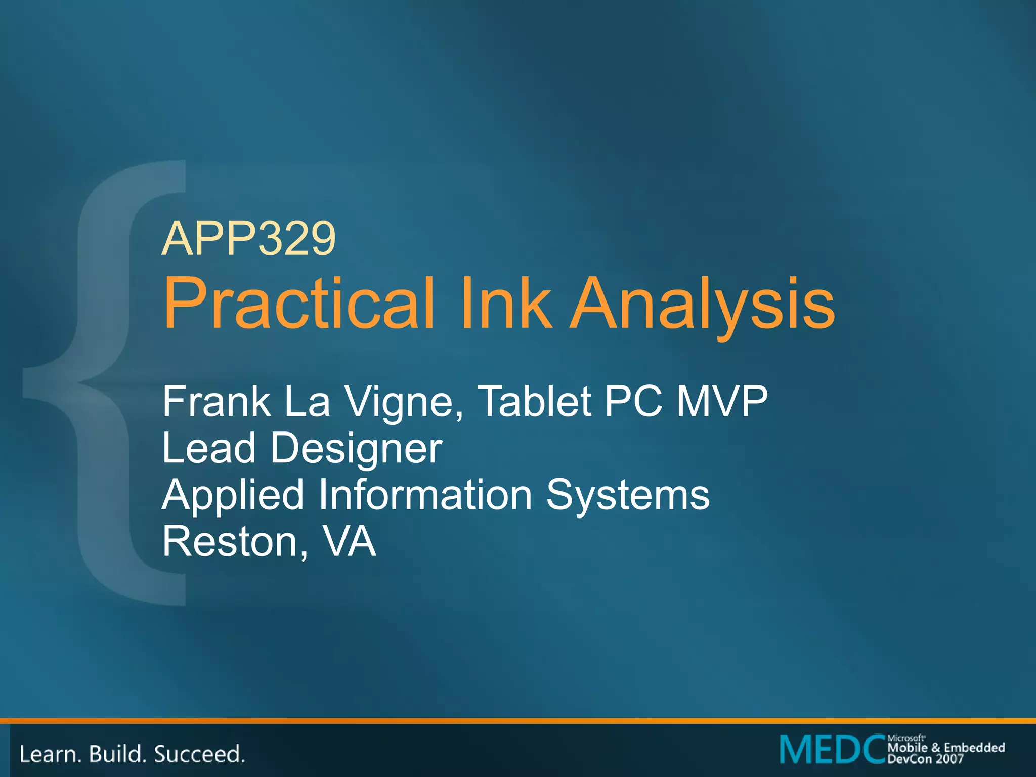The document summarizes a presentation by Frank La Vigne on practical ink analysis. It discusses digital ink basics, limitations of word recognition, moving from strings to documents using the InkAnalyzer API, improving recognition results through hints and factoids, detecting relationships in ink using ContextLinks, and shape recognition. The presentation aims to provide practical solutions for developers working with digital ink.