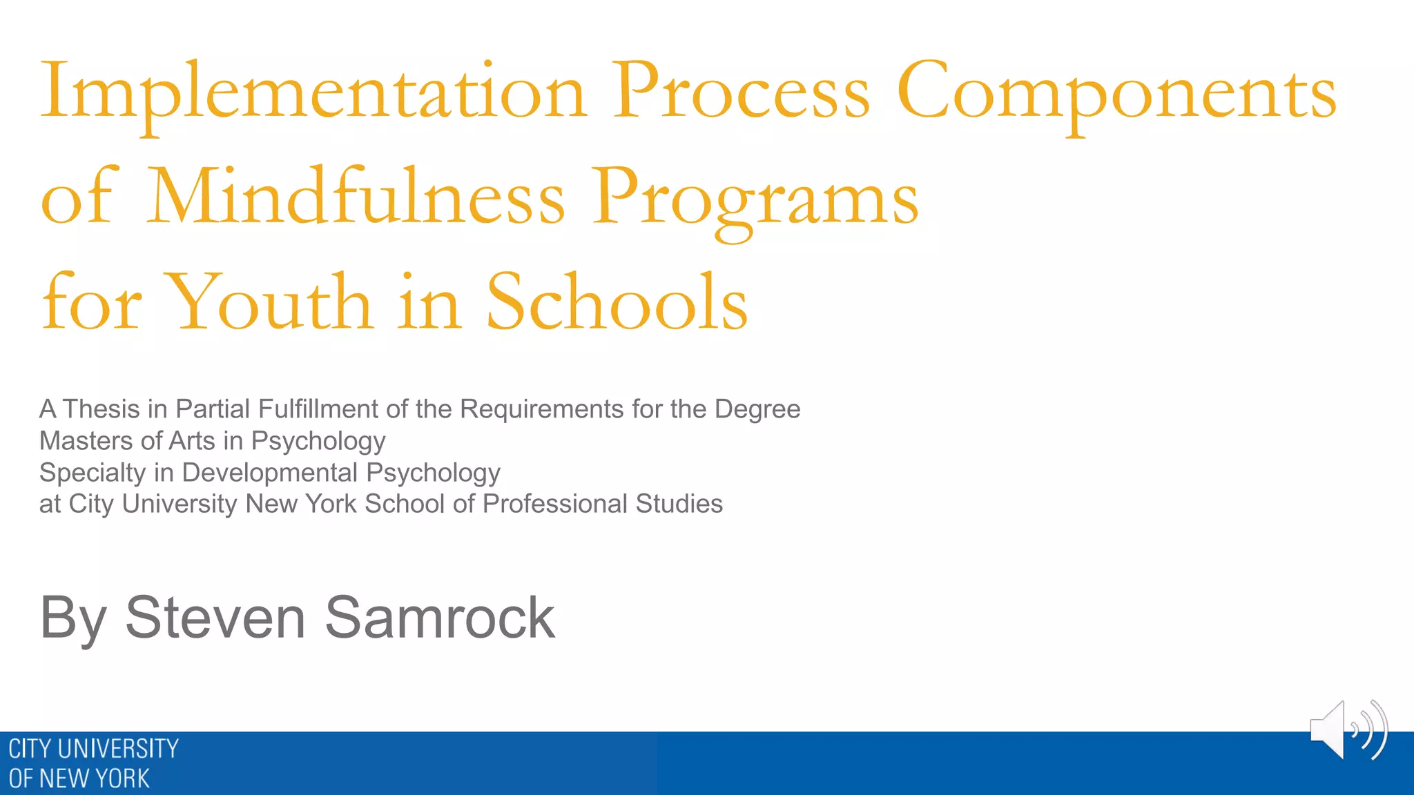 The document discusses a thesis on implementing mindfulness programs in schools. It begins by defining mindfulness and describing typical school-based mindfulness programs. It then reviews the current research, which shows benefits but is limited. Recommendations are made to improve research methods and clearly define program components. Core process components hypothesized to influence program outcomes include instructor training, attitudes, embodiment of mindfulness, personal characteristics, role, and ability to adhere to curriculum while responding flexibly to students. Qualitative interviews explore these components from the perspective of mindfulness instructors.
