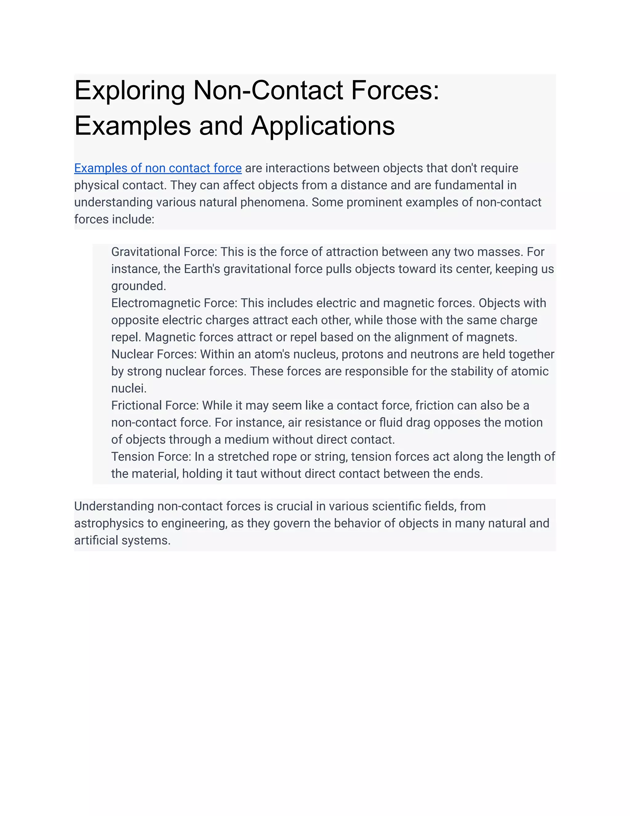 The document explores non-contact forces, which are interactions between objects that occur without physical contact. Key examples include gravitational force, electromagnetic force, nuclear forces, frictional force, and tension force, all of which play vital roles in various natural phenomena and scientific fields. Understanding these forces is essential for studying the behavior of objects in both natural and artificial systems.