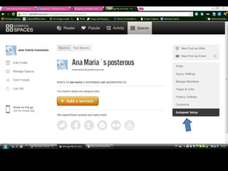 This document provides updates from Ana Maria Menezes on various online resources and projects for students, including a course portfolio, personal and class blogs, online resources for learning, and joint projects for students to record their work both in and out of class. Contact information is also provided for two personal blogs on having fun with English and an image a week, as well as for a class blog and email address.
