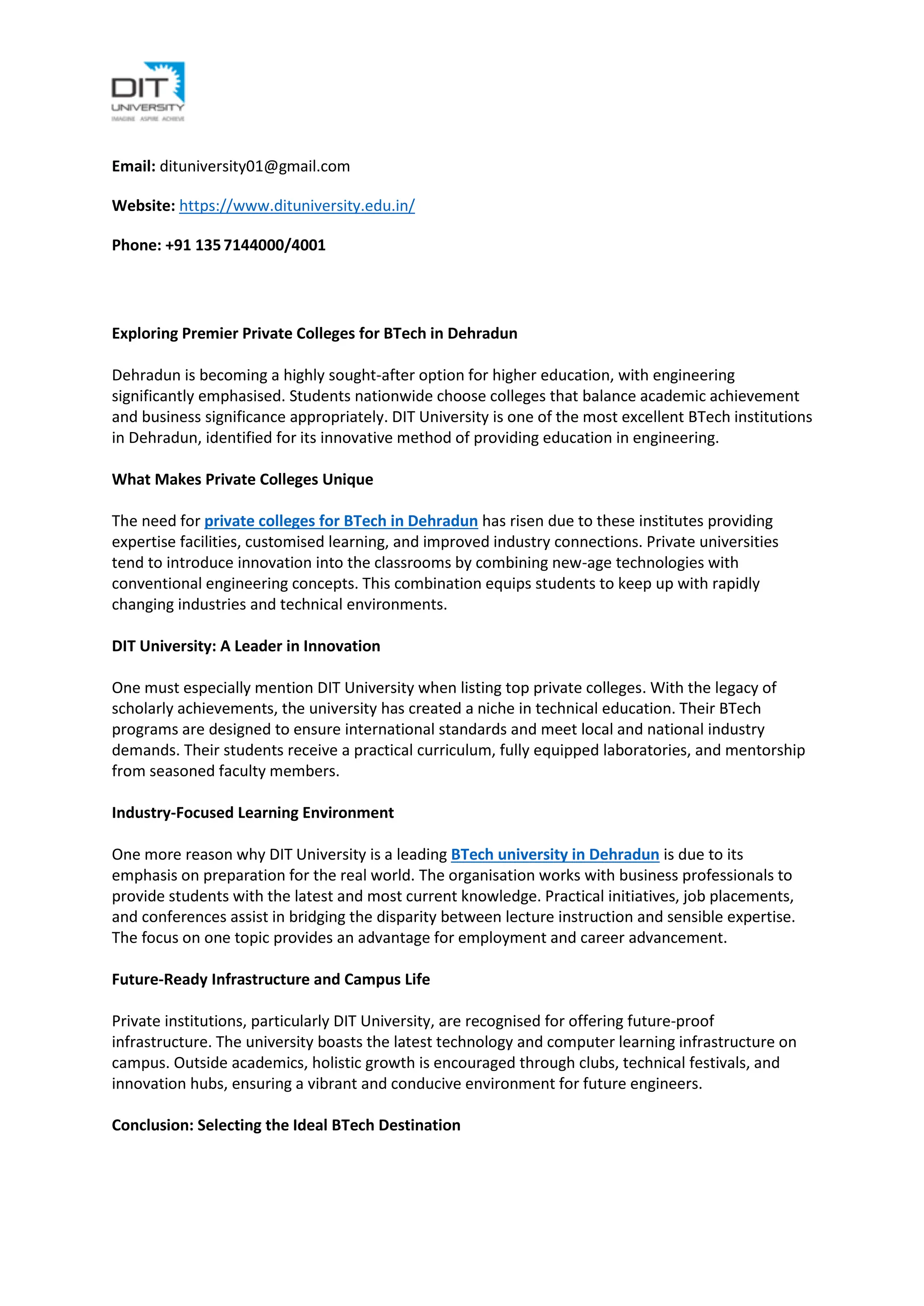 Dehradun is becoming a highly sought-after option for higher education, with engineering significantly emphasised. Students nationwide choose colleges that balance academic achievement and business significance appropriately. DIT University is one of the most excellent BTech institutions in Dehradun, identified for its innovative method of providing education in engineering.