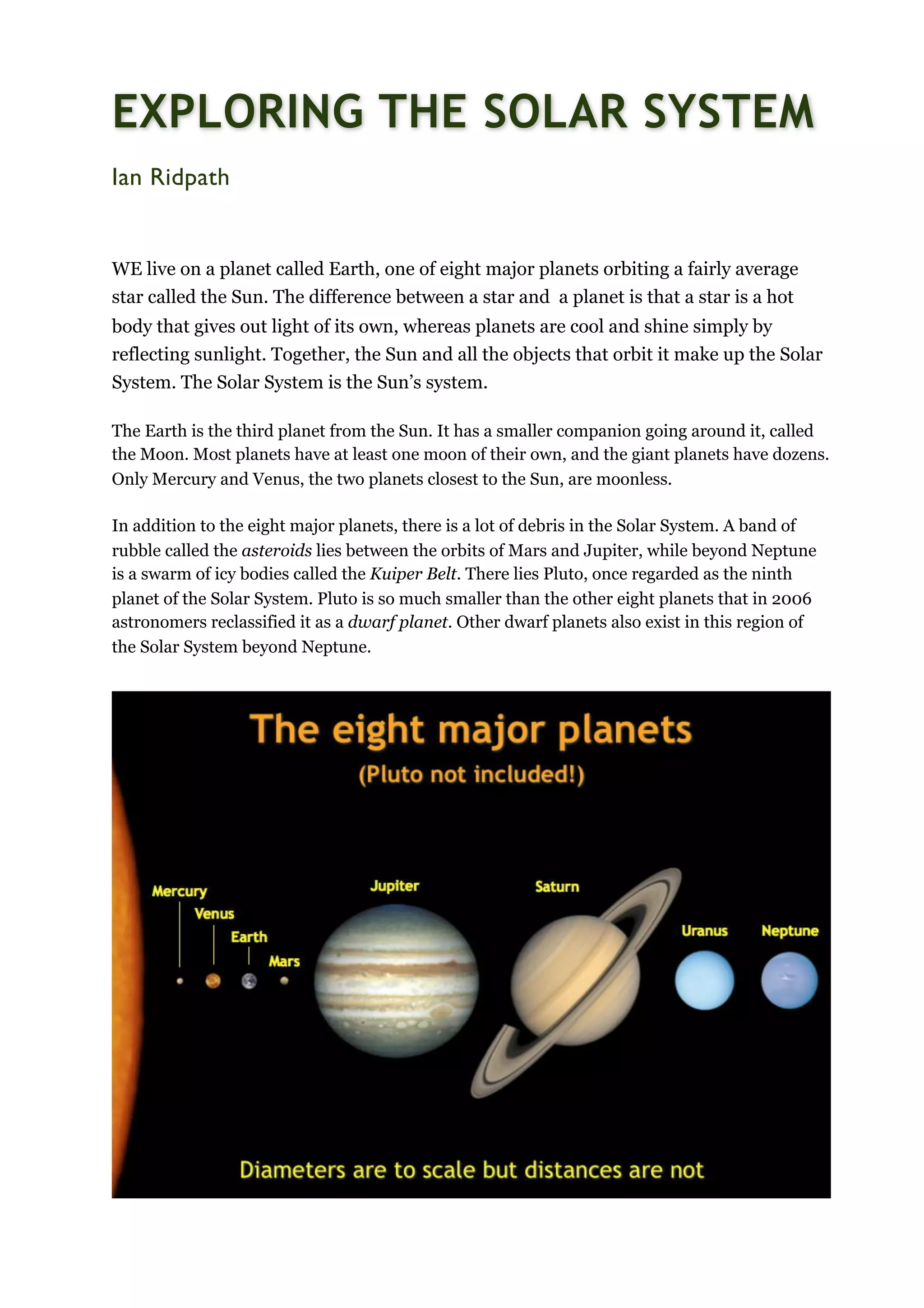 The document provides an overview of the solar system, detailing its structure, including the sun and its eight major planets, as well as dwarf planets, moons, and asteroids. It highlights the characteristics of Mercury, Venus, and Mars, discussing their physical features, atmospheres, and exploration history. The text also addresses the significance of asteroids and the ongoing efforts to study these celestial bodies, as well as the potential for life on Mars.