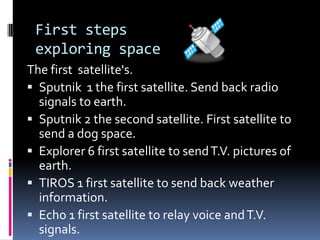 The document summarizes key events and accomplishments in the exploration of space. It discusses the first satellites launched by the Soviet Union and United States, including Sputnik 1, the first satellite in space. It also covers the space race between the two countries to put the first astronaut in space, which the Soviet Union won by launching Yuri Gagarin in 1961. Finally, it discusses the US achieving the milestone of the first manned lunar landing by Neil Armstrong and Buzz Aldrin in 1969.