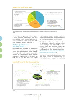 The document discusses the concept of the 'connected car', which integrates advanced technologies like mechatronics, telematics, and AI to enhance safety, entertainment, and connectivity for drivers, transforming vehicles into mobile information hubs. It highlights the growth of the automotive industry fueled by the emergence of mobile applications, cloud solutions, and changing consumer demands for personalization and seamless connectivity. The connected car presents significant market opportunities for stakeholders while facing challenges in security and consumer reluctance to pay for connectivity services.