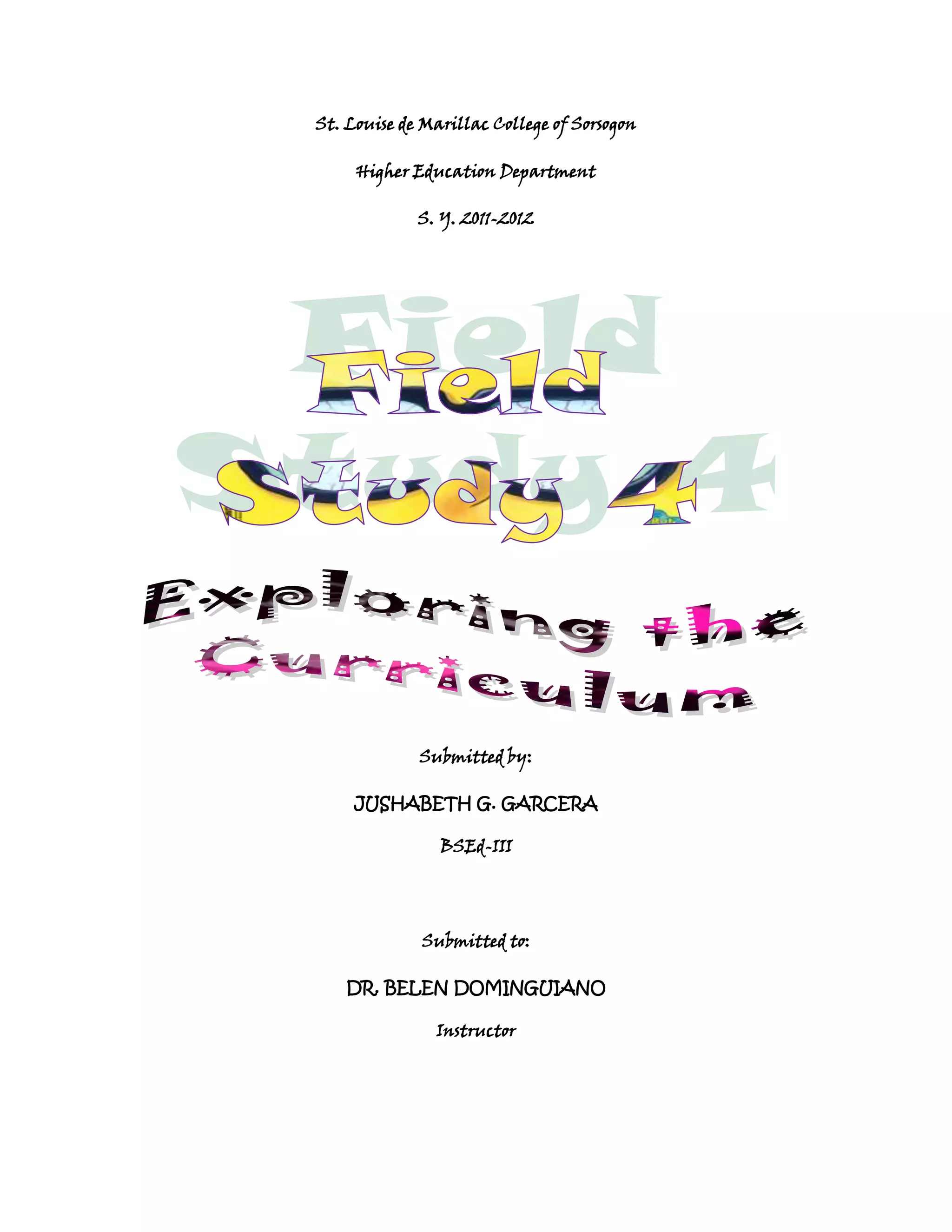This document appears to be a field study report submitted by a student named Jushabeth G. Garcera for her Bachelor of Secondary Education program. The report documents her observations at St. Louise de Marillac College of Sorsogon related to exploring concepts of the curriculum. Over three episodes, she examines the concepts, nature, and purposes of the curriculum; identifies the components and approaches of the curriculum; and discusses new approaches to teaching and learning. She includes tools used during her observations, analyses of her findings, reflections, and documentation for her portfolio. The report provides insights into how the school translates its curriculum into practice in the classroom.